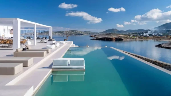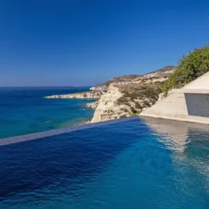 En Grèce, la piscine s’intègre dans une architecture ouverte sur la mer.