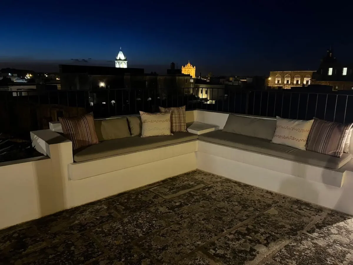 Deuxième étage : terrasse panoramique équipée de canapés en maçonnerie, kitchenette, table à manger et pergola pour les repas en plein air avec vue sur le centre historique de Muro Leccese.