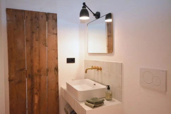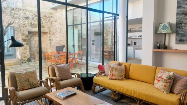 Rez-de-chaussée : hall d’entrée spacieux ; 1 grande chambre double avec salle de bain-douche ; 1 seconde chambre double avec salle de bain-douche aménagée dans un ancien four à pain voûté ; buanderie (lave-linge et sèche-linge) ; toilette invités ; espace jour lumineux avec salon, cheminée, bibliothèque et grande cuisine équipée ouvrant sur une cour intérieure aménagée.