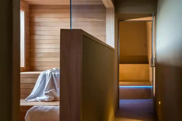 MANOIR : premier étage : séjour avec cheminée ; salle à manger ; cuisine ; 1 salle de bain avec douche (accessible aux personnes à mobilité réduite) ; 2 chambres doubles (lit king size 180×200 cm) avec salle de douche attenante ; 1 chambre double (160×200 cm) avec salle de douche attenante ; terrasse. Rez-de-chaussée (entrée extérieure) : espace bien-être avec sauna, hammam et douche ; 1 salle de bain ; espace fitness avec salle de massage ; buanderie.