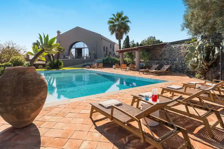 Villa Constanza est une vaste résidence exclusive avec piscine privée située à proximité de Pozzillo, charmant village de pêcheurs dans les environs d’Acireale, sur la côte est de la Sicile. À seulement 800 mètres de la mer, elle bénéficie d’un emplacement privilégié entre littoral méditerranéen et paysages volcaniques de l’Etna.