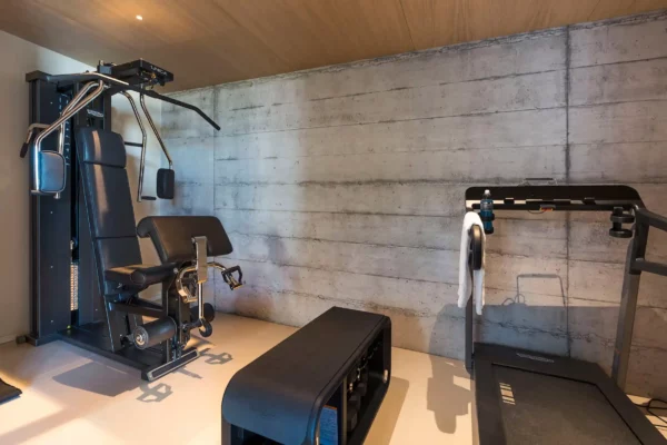 Rez-de-chaussée : grand séjour avec TV et coin repas ; cuisine ; 1 salle de bain invités ; buanderie. Premier étage : entrée, 1 chambre double (180×200 cm) avec douche en suite ; 2 chambres doubles (160×200 cm) avec douche en suite. Étage inférieur : 1 chambre double (180×200 cm) avec salle de bain-douche et mini bar, espace fitness et espace bien-être (bain à remous, sauna, bain turc, douche émotionnelle et salle de bain), cave.