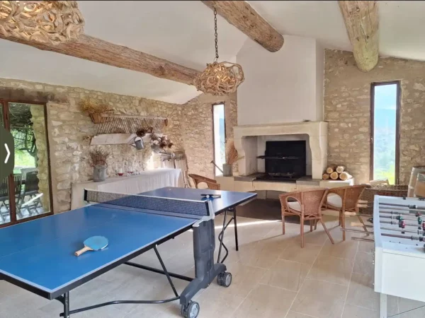À proximité de la cuisine, un pool house accueille un espace jeux ainsi qu’une terrasse ombragée aménagée d’une grande table pour les repas en extérieur. Un potager complète l’ensemble. La piscine chauffée à débordement, sécurisée par un volet roulant, est volontairement située à distance du mas afin de préserver calme et sérénité, accessible par un chemin traversant un verger.