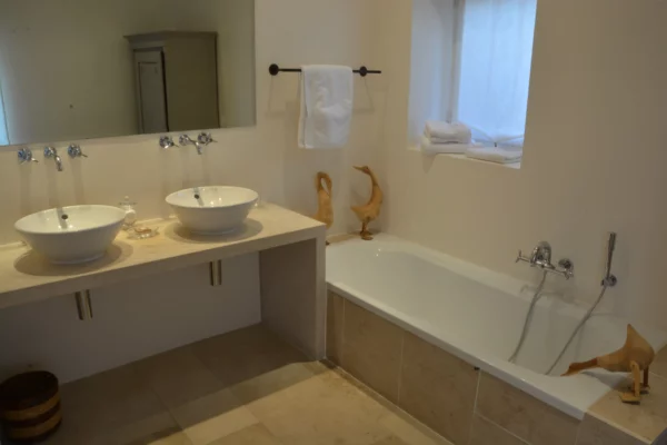 Rez-de-chaussée (près du salon) : 1 lit 180 cm avec salle de bain (douche, baignoire, 2 vasques). WC séparés. Premier étage : 1 lit 180 cm avec salle de bain (douche, baignoire, 2 vasques), WC séparés, dressing et espace bureau. 2 lits 90 cm avec salle d’eau (douche, vasque). WC. 1 lit 180 cm avec salle d’eau ouverte (douche, vasque). 1 lit 180 cm avec salle de bain (baignoire, 2 vasques, WC). Une autre chambre avec 1 lit 180 cm avec salle d’eau (douche, 2 vasques, WC) et accès à une mezzanine avec 5 lits 90 cm. Deuxième étage : 2 lits 90 cm avec salle d’eau (douche, vasque). WC séparés. 1 lit 180 cm avec salle d’eau (douche, 2 vasques), WC séparés et accès à une mezzanine avec 3 lits 90 cm.
