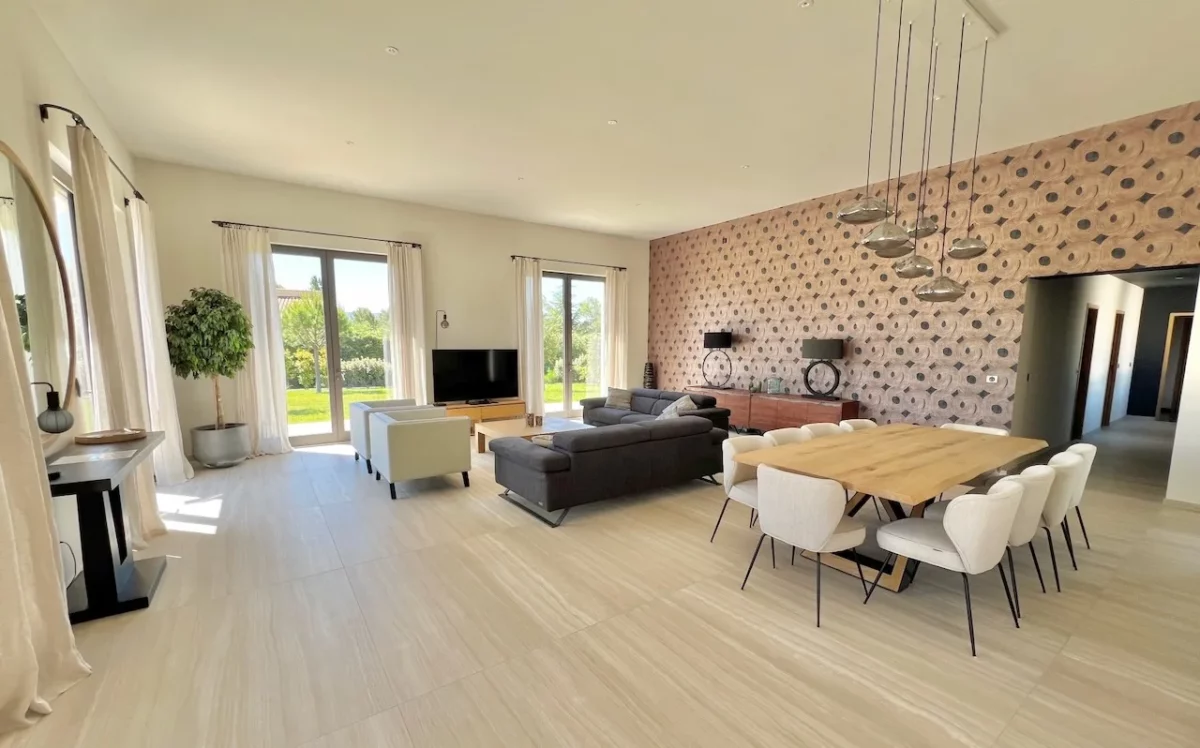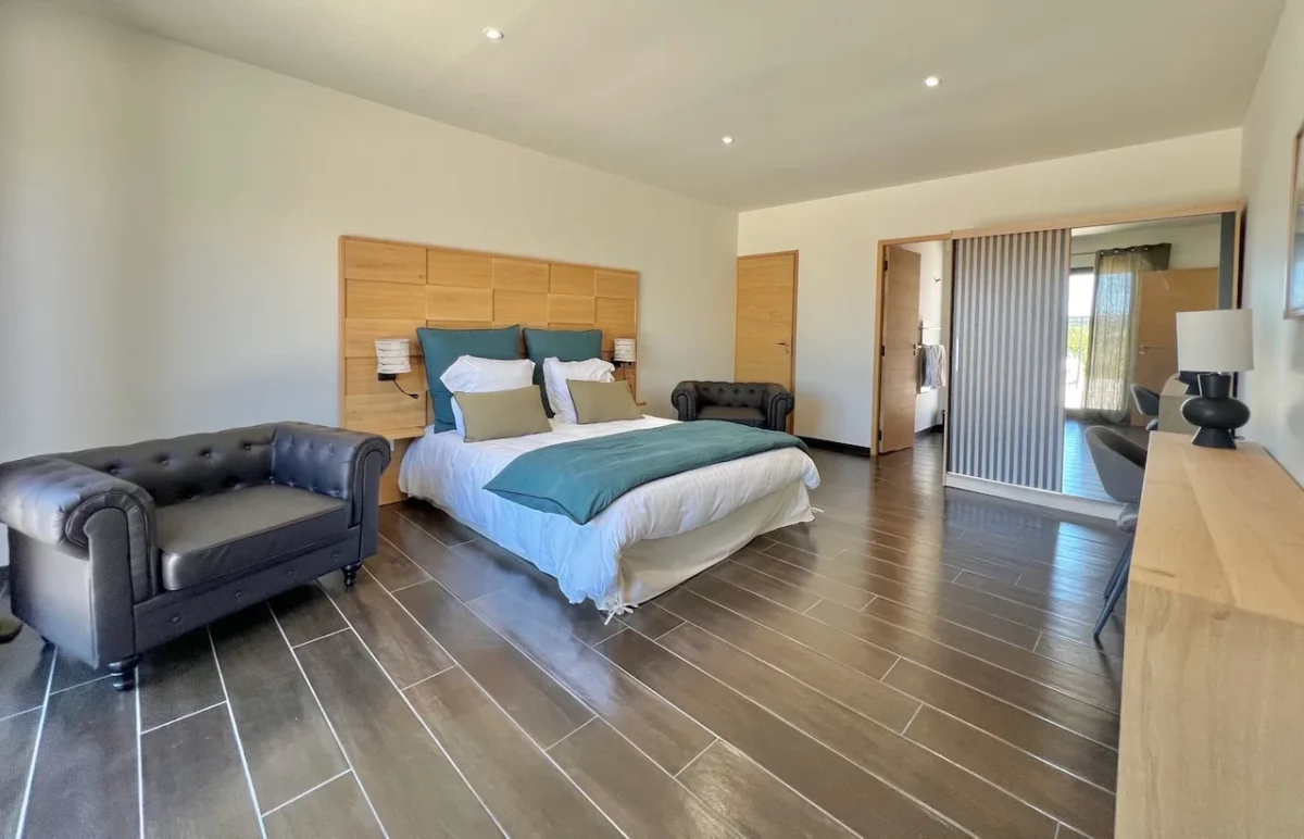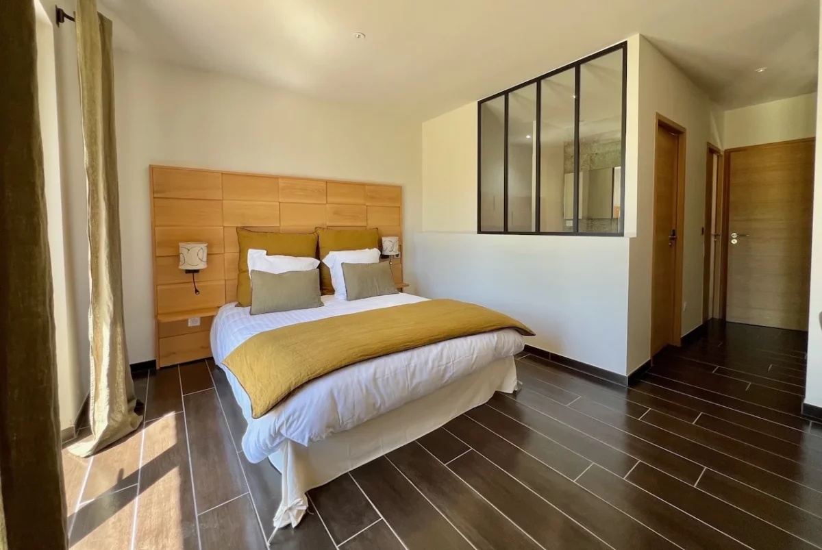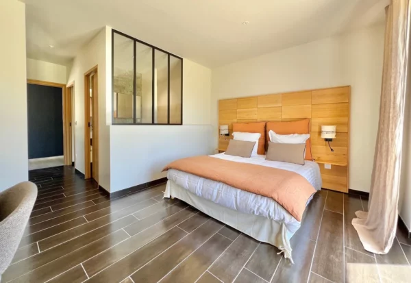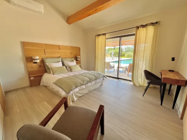 Denise séduit par ses espaces de vie spacieux et lumineux. La maison principale abrite un grand séjour avec cuisine équipée, salle à manger et salon ouvrant directement sur le jardin et la terrasse. Les 3chambres en suite de l’aile gauche offrent un accès direct à la terrasse principale. L’aile droite comprend une quatrième chambre en suite, tandis qu’une annexe indépendante face au pool house accueille la cinquième chambre. Toutes les chambres sont climatisées et disposent de leur propre salle d’eau, garantissant intimité et confort à chaque invité.