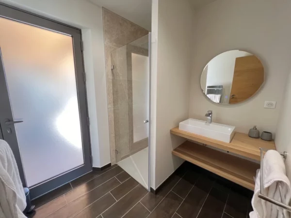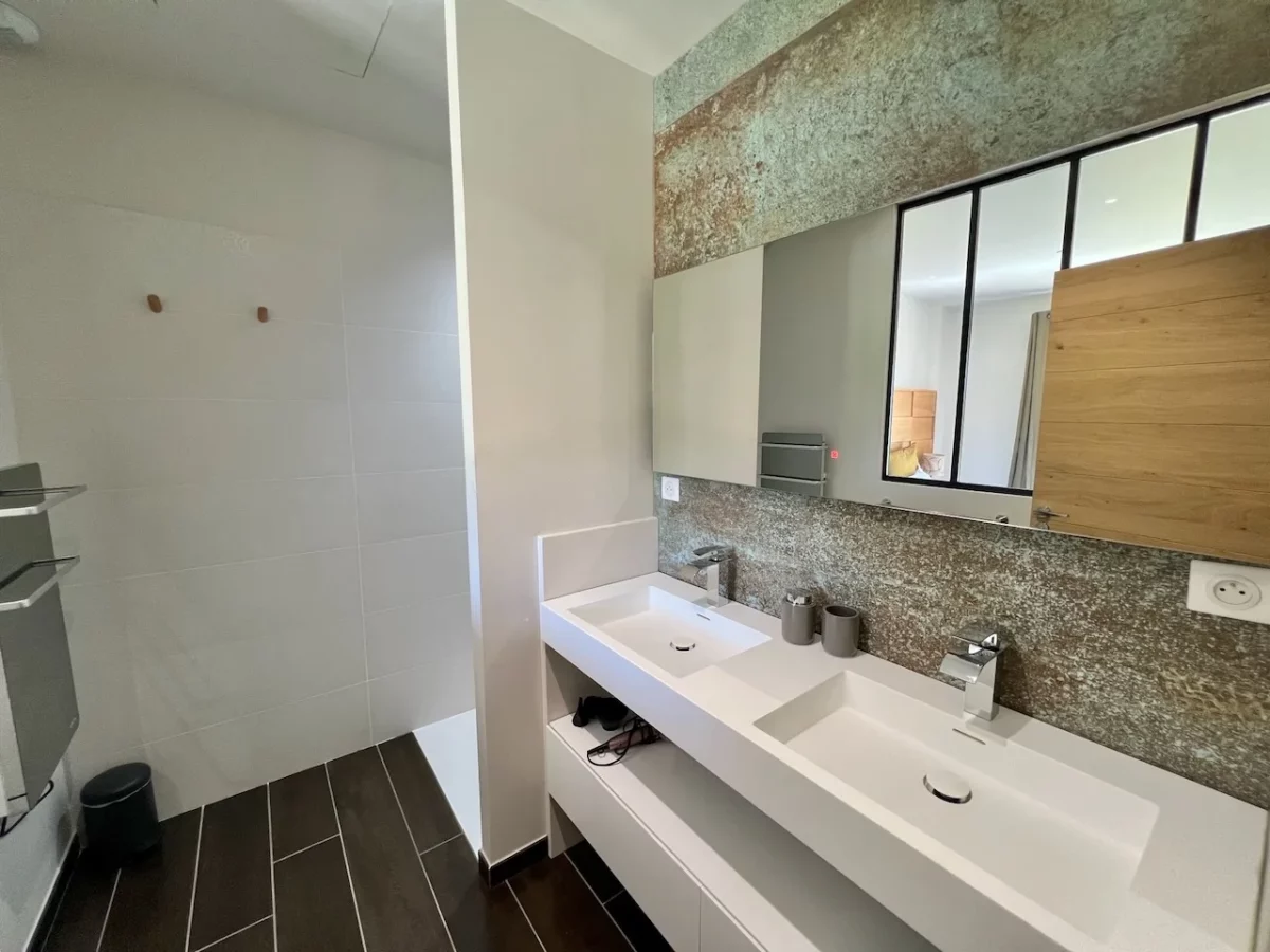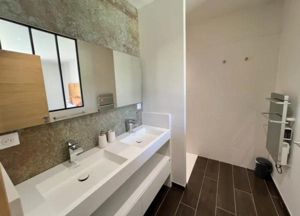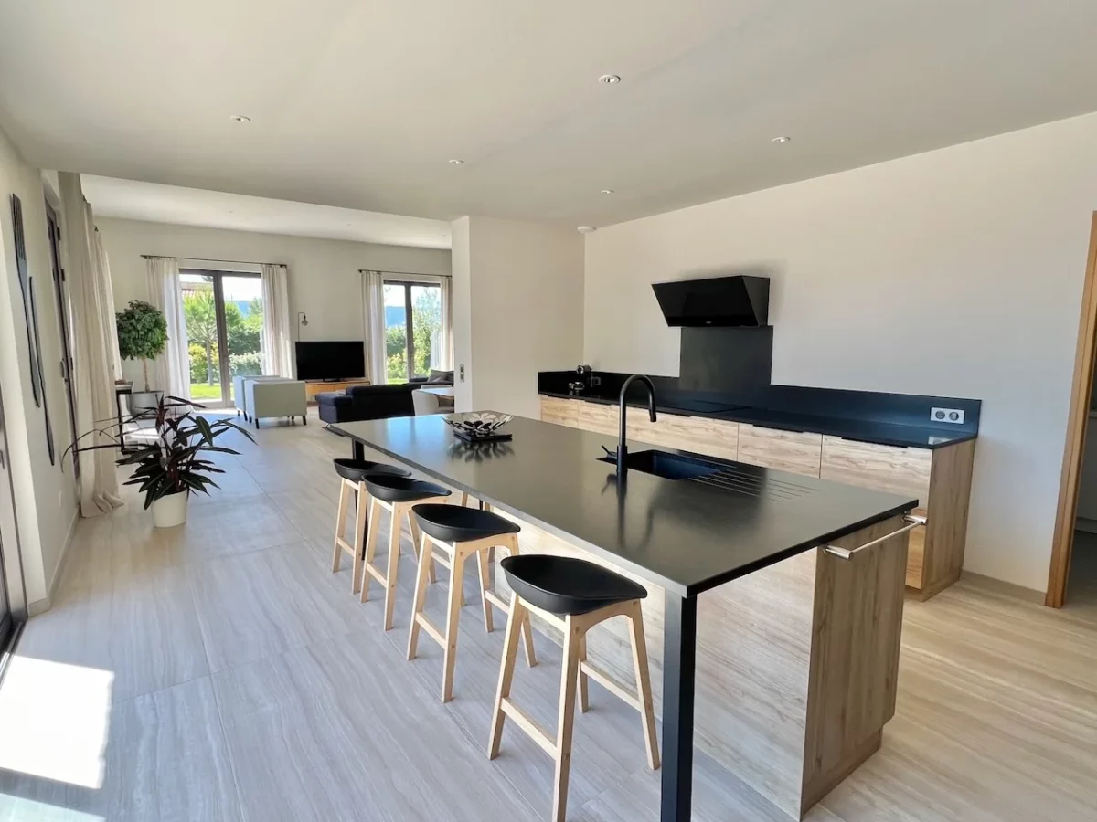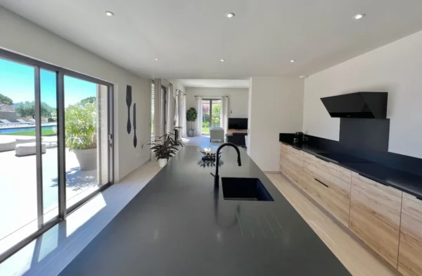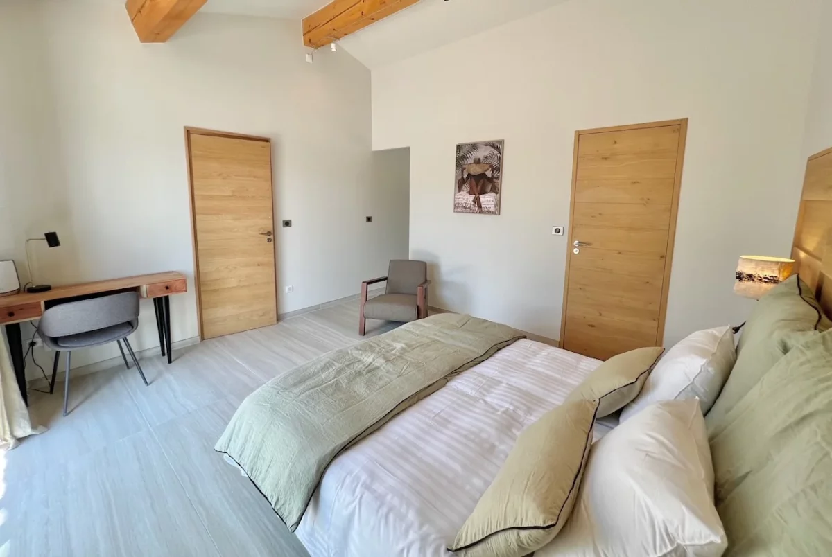 Denise séduit par ses espaces de vie spacieux et lumineux. La maison principale abrite un grand séjour avec cuisine équipée, salle à manger et salon ouvrant directement sur le jardin et la terrasse. Les 3chambres en suite de l’aile gauche offrent un accès direct à la terrasse principale. L’aile droite comprend une quatrième chambre en suite, tandis qu’une annexe indépendante face au pool house accueille la cinquième chambre. Toutes les chambres sont climatisées et disposent de leur propre salle d’eau, garantissant intimité et confort à chaque invité.