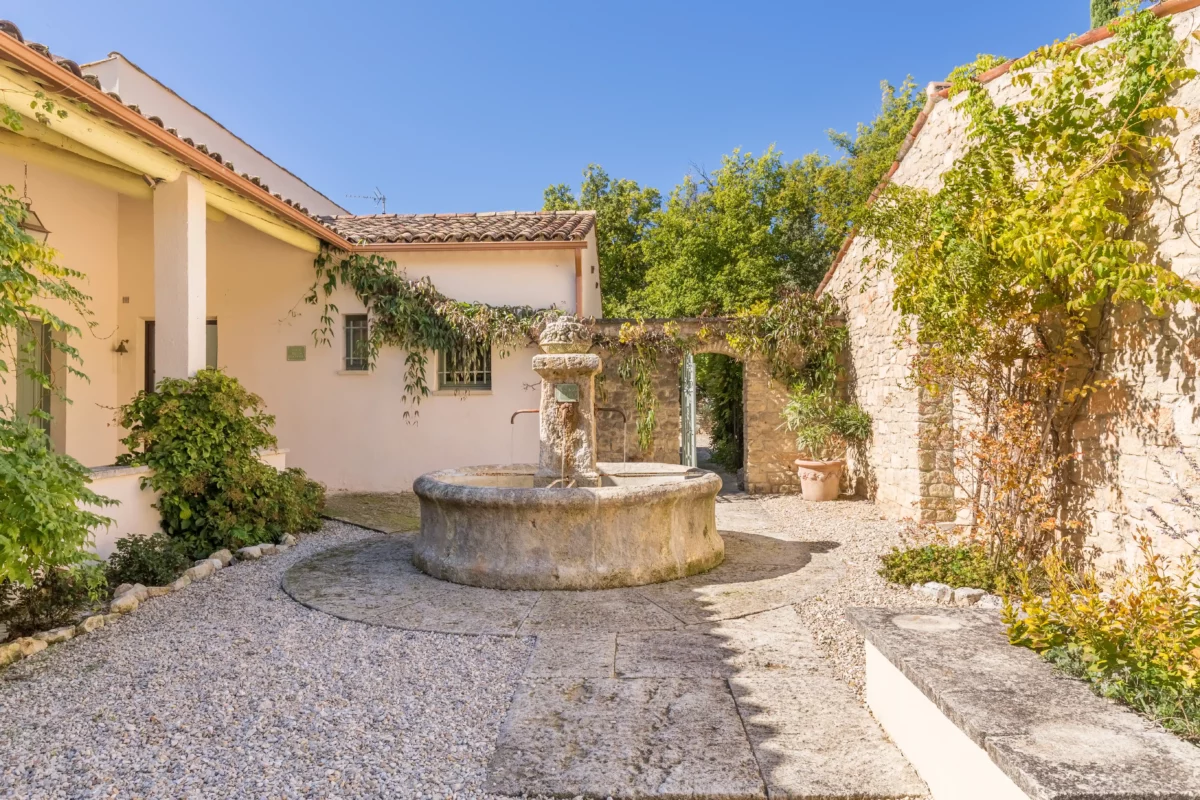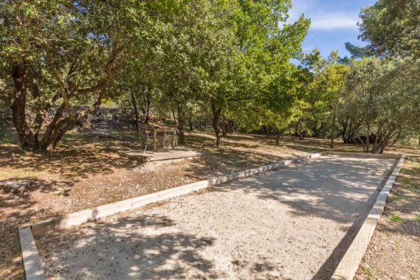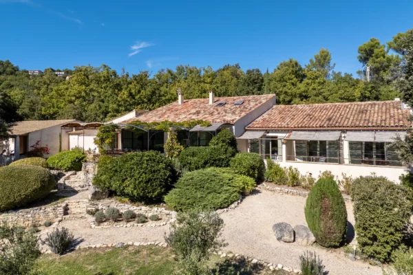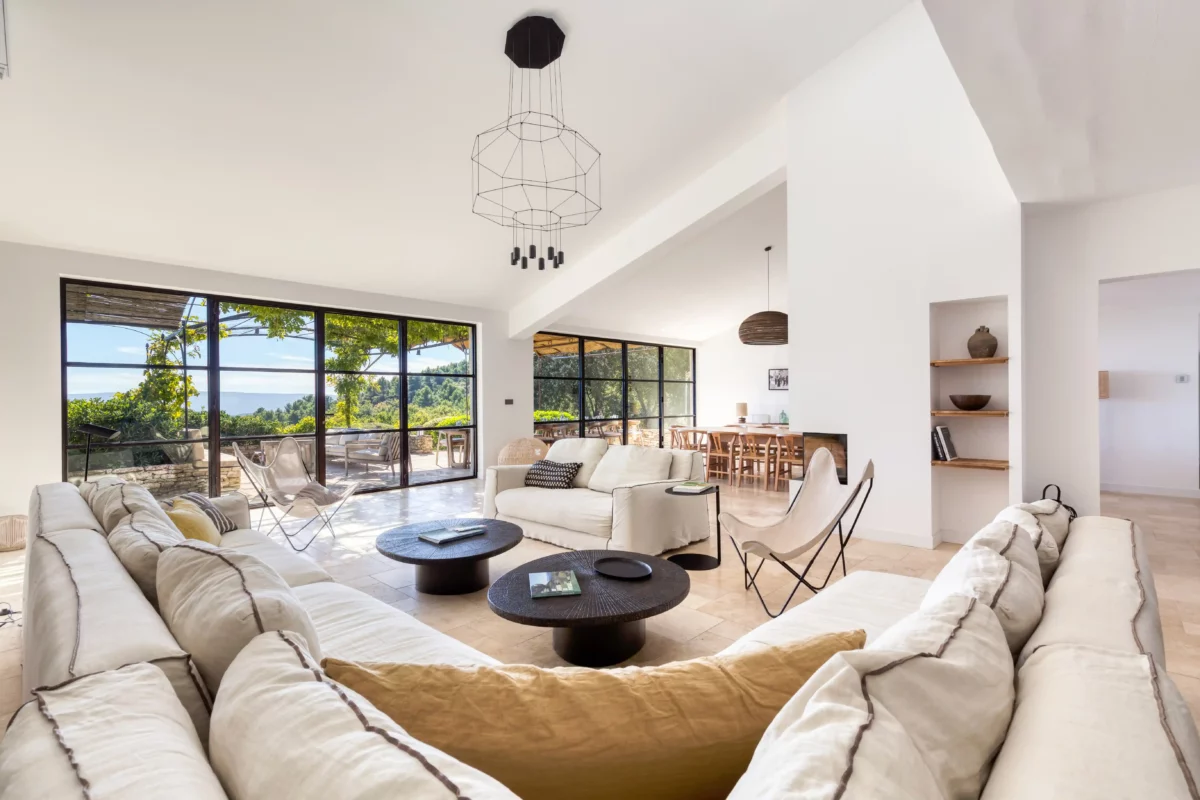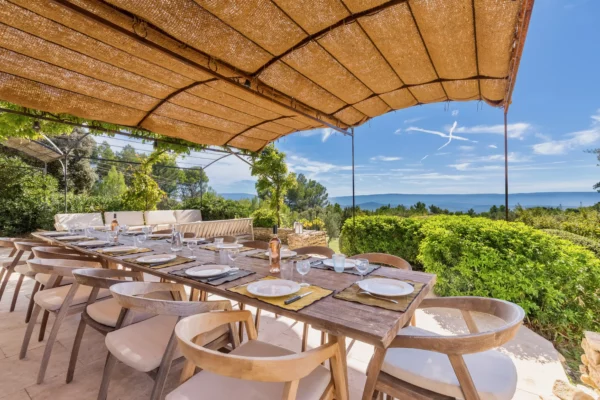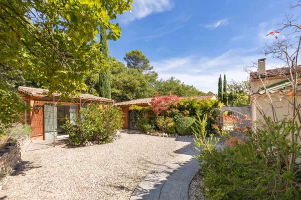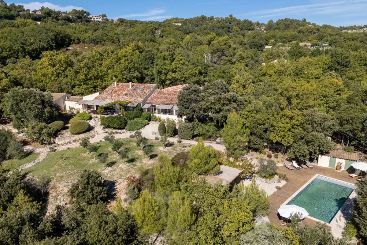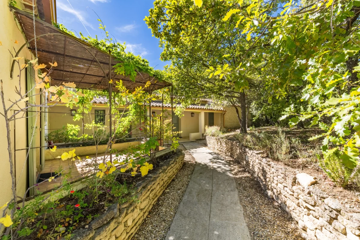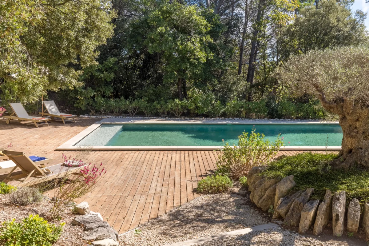 À l’extérieur, Solaine s’étend sur un terrain non clos d’environ un hectare, planté de pins, de chênes verts et d’oliviers, garantissant une atmosphère naturelle et une grande tranquillité. Un petit sentier permet d’accéder à la piscine sécurisée, située en contrebas de la maison, bordée d’une terrasse ombragée idéale pour se détendre au bord de l’eau. Accessible directement depuis le séjour, une vaste terrasse aménagée invite aux repas d’été, face à la vue dégagée sur la vallée du Luberon.