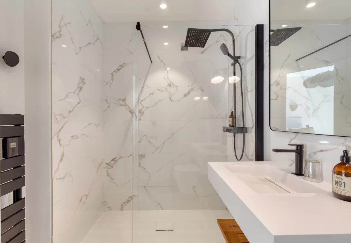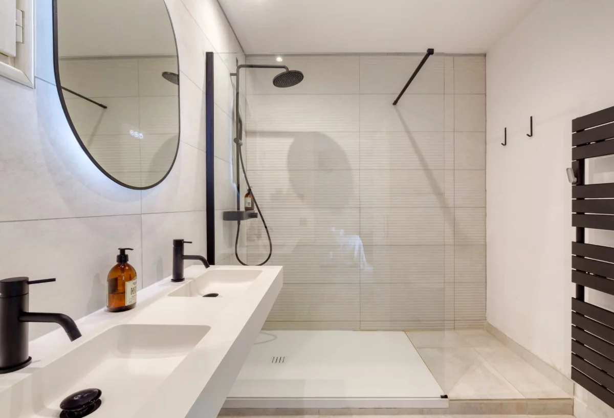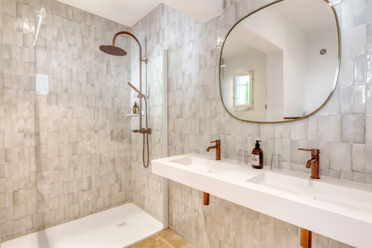 Première aile à gauche de l’entrée principale : chambre (lit de 180 cm) ; salle d’eau (douche ; vasque et toilettes) ; chambre (lit de 180 cm) ; salle de bains ouverte sur la chambre (baignoire ; douche ; 2 vasques ; toilettes séparées) ; chambre (lit de 180 cm) ; salle d’eau (douche ; deux vasques et toilettes).