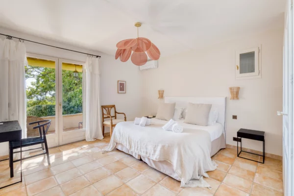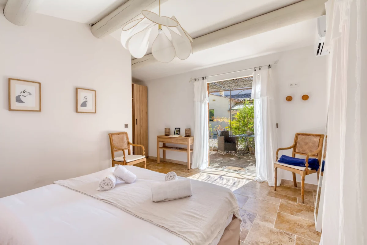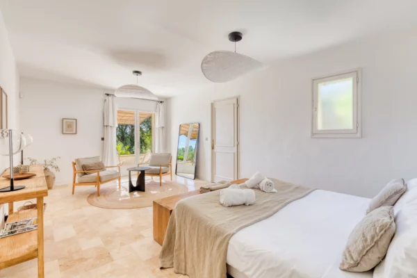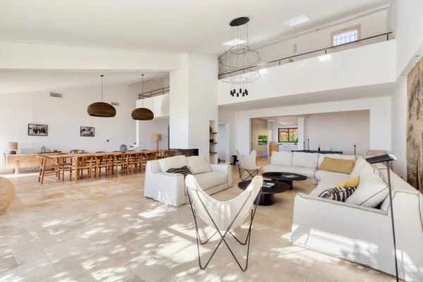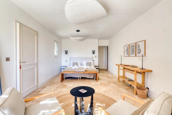 Entièrement de plain-pied, la maison se compose d’un bâtiment principal avec entrée, séjour lumineux avec salon et cheminée, salle à manger pour seize personnes, cuisine équipée et chambre principale en suite. Les sept autres chambres, accessibles par un hall, disposent chacune d’une entrée indépendante, assurant une organisation fluide et préservant l’intimité de chacun. L’ensemble de la propriété est climatisé et décoré dans une atmosphère chaleureuse, offrant un confort optimal tout au long de l’année.