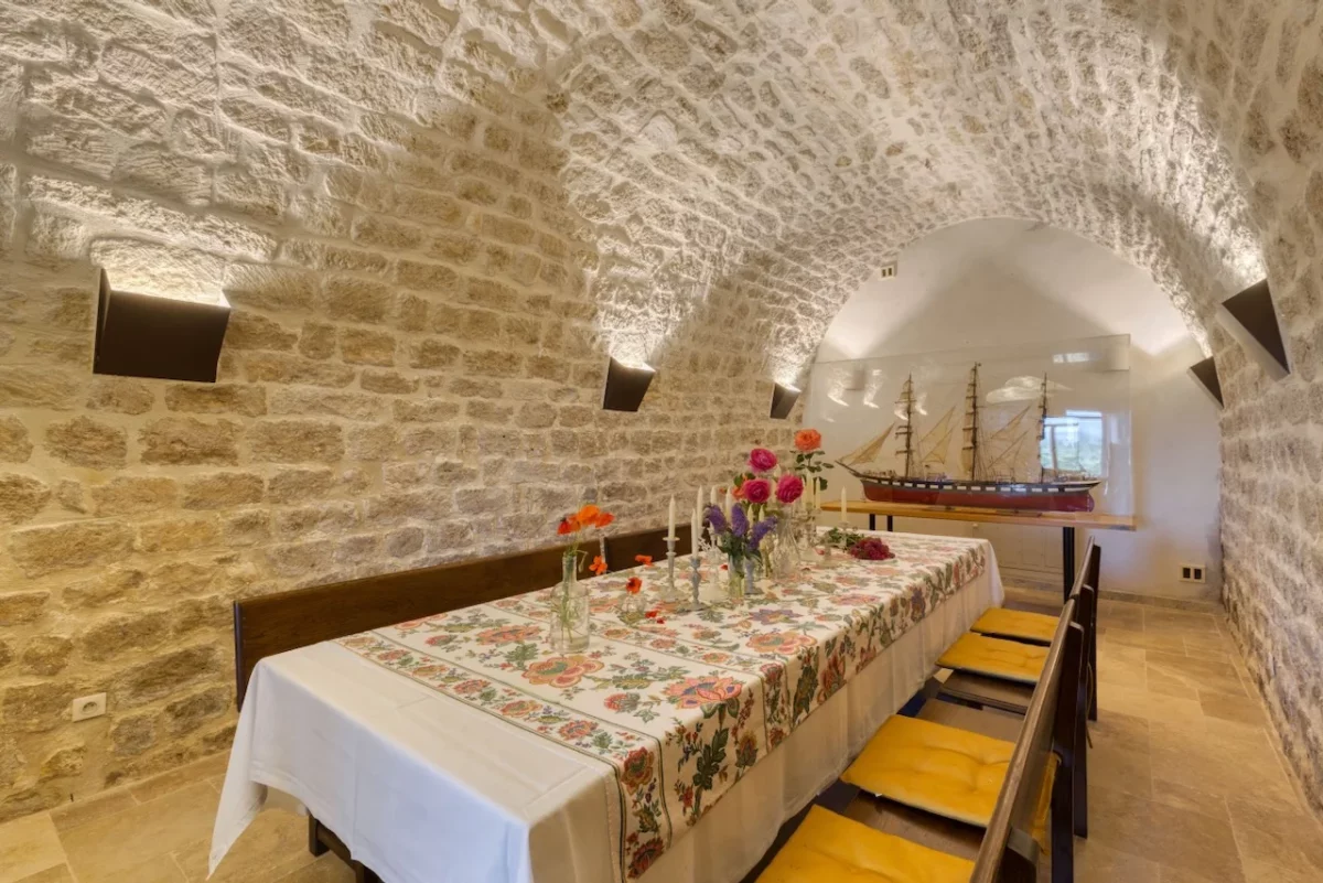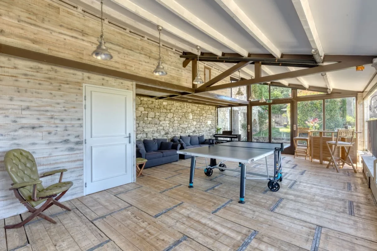 Les espaces de vie intérieurs sont généreux et pensés pour la convivialité. La maison dispose de 2 cuisines entièrement équipées, d’une grande salle à manger voûtée, d’un salon spacieux pour se détendre ou regarder la télévision. Enfin, vous disposez d’une salle de jeux dédiée aux moments de loisir, pour petits et grands.