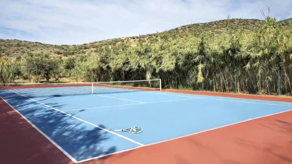 L’extérieur constitue le cœur du domaine. La piscine privée d’eau salée s’ouvre sur des espaces lounge ombragés et une pergola dédiée aux repas en plein air. Vathi Landing dispose également d’un hammam privé, d’une salle de sport entièrement équipée, d’un court de tennis et d’une aire de jeux, offrant un équilibre idéal entre détente et activité.