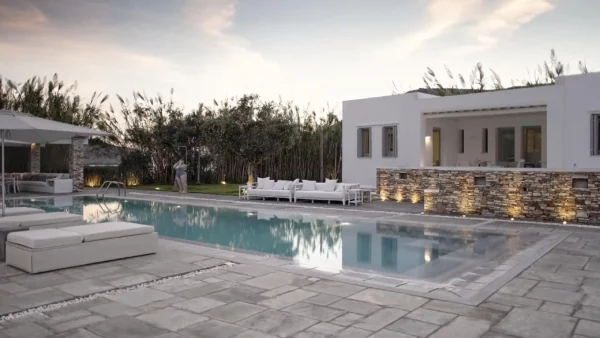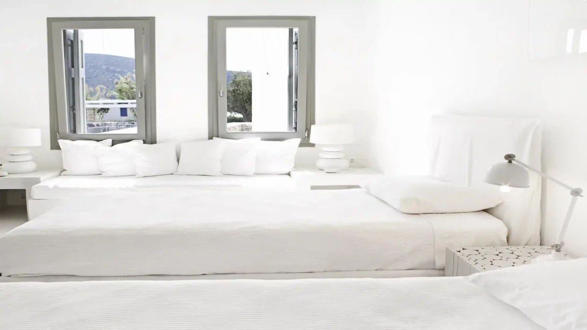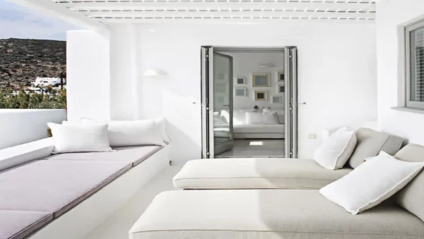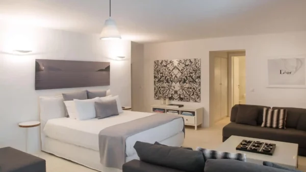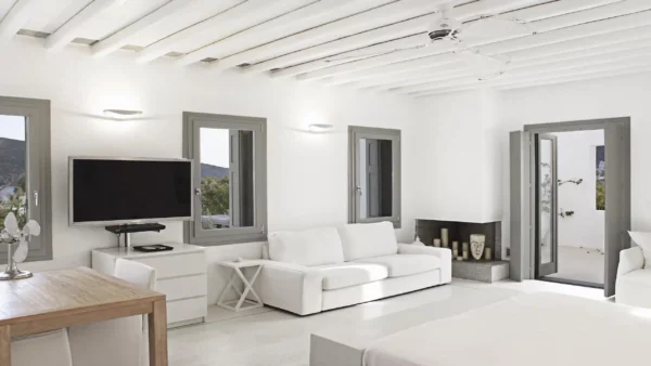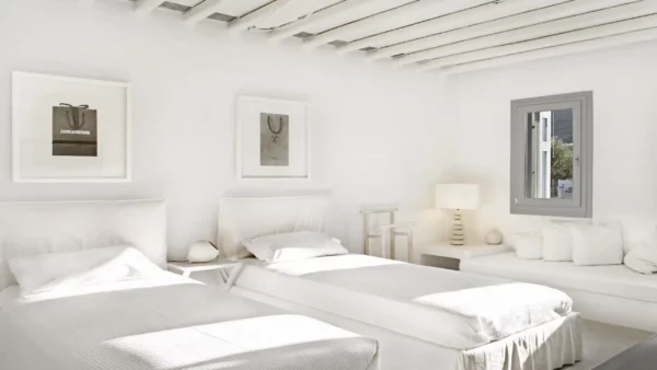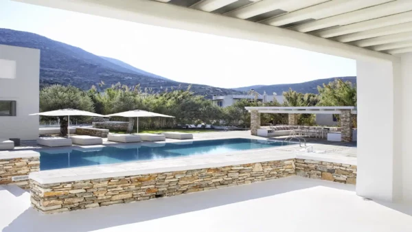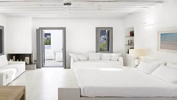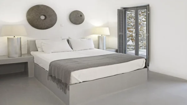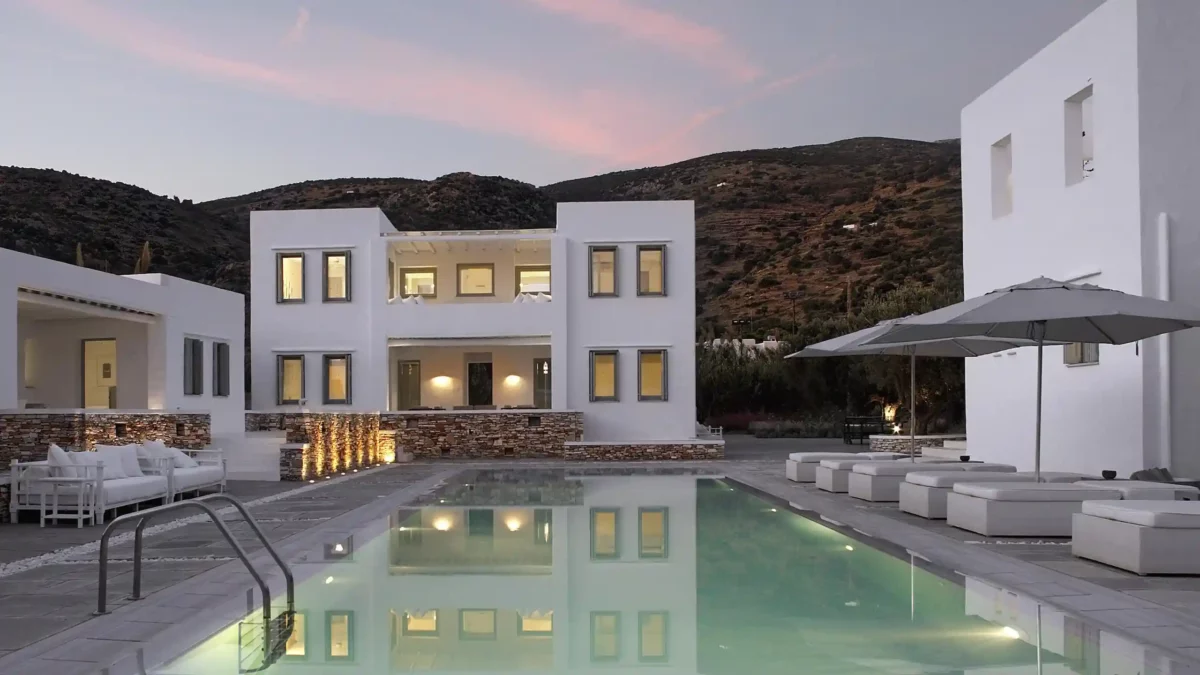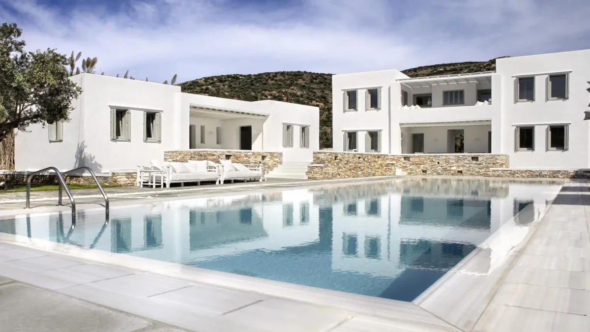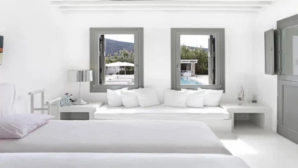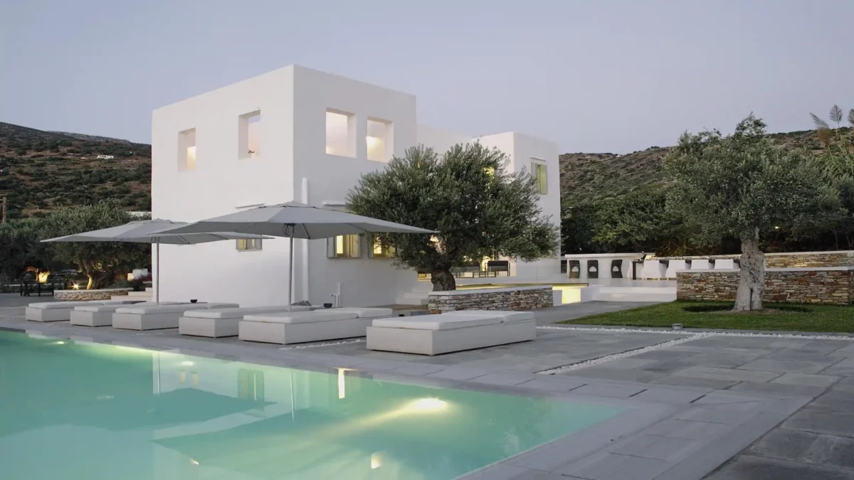 Conçue pour accueillir jusqu’à 18 personnes (830 m2), la propriété offre neuf chambres réparties harmonieusement entre les trois bâtiments. Les intérieurs, inspirés de l’architecture traditionnelle sifniote, associent lignes épurées et confort contemporain. Chaque suite dispose de sa salle de bain attenante et de la climatisation, assurant intimité et fluidité de séjour pour les grands groupes.