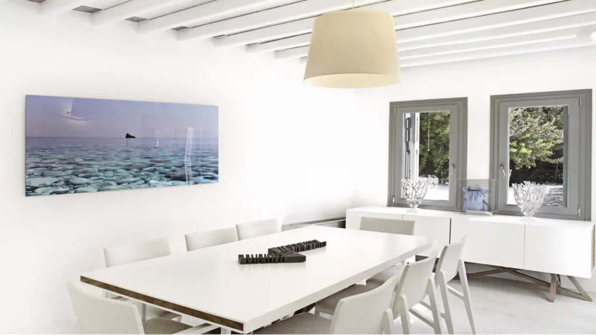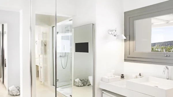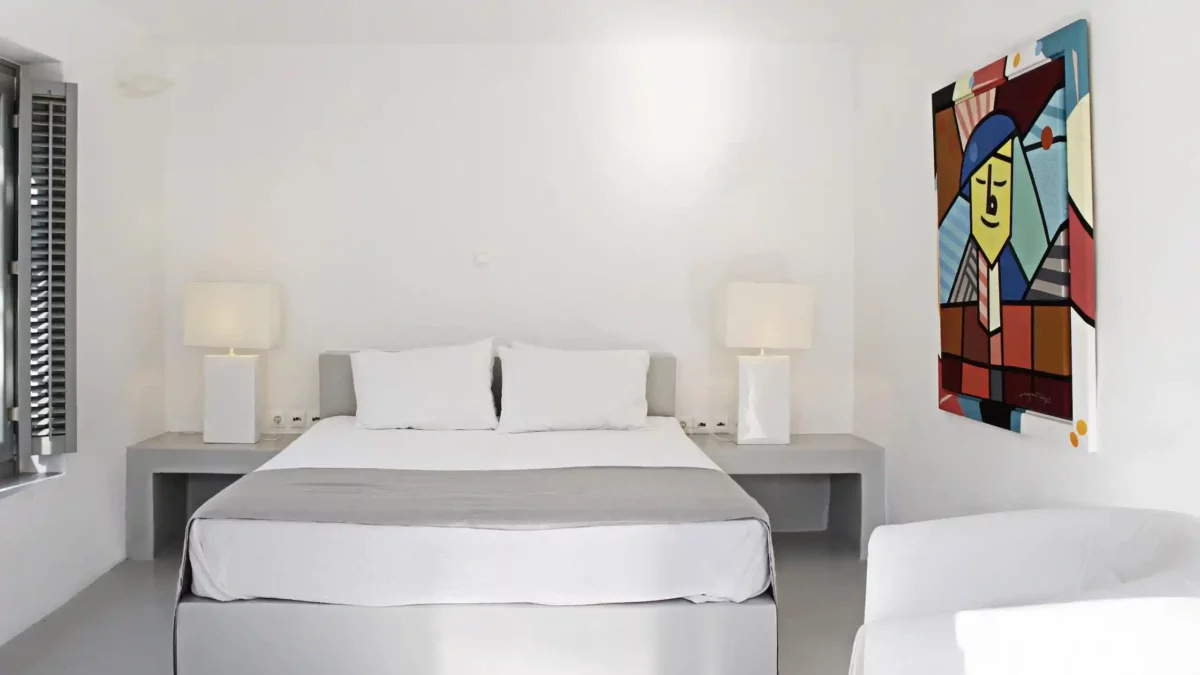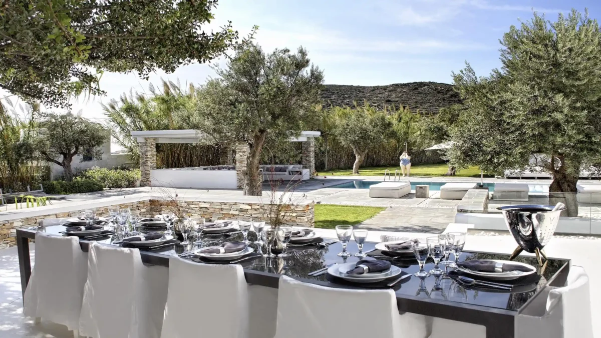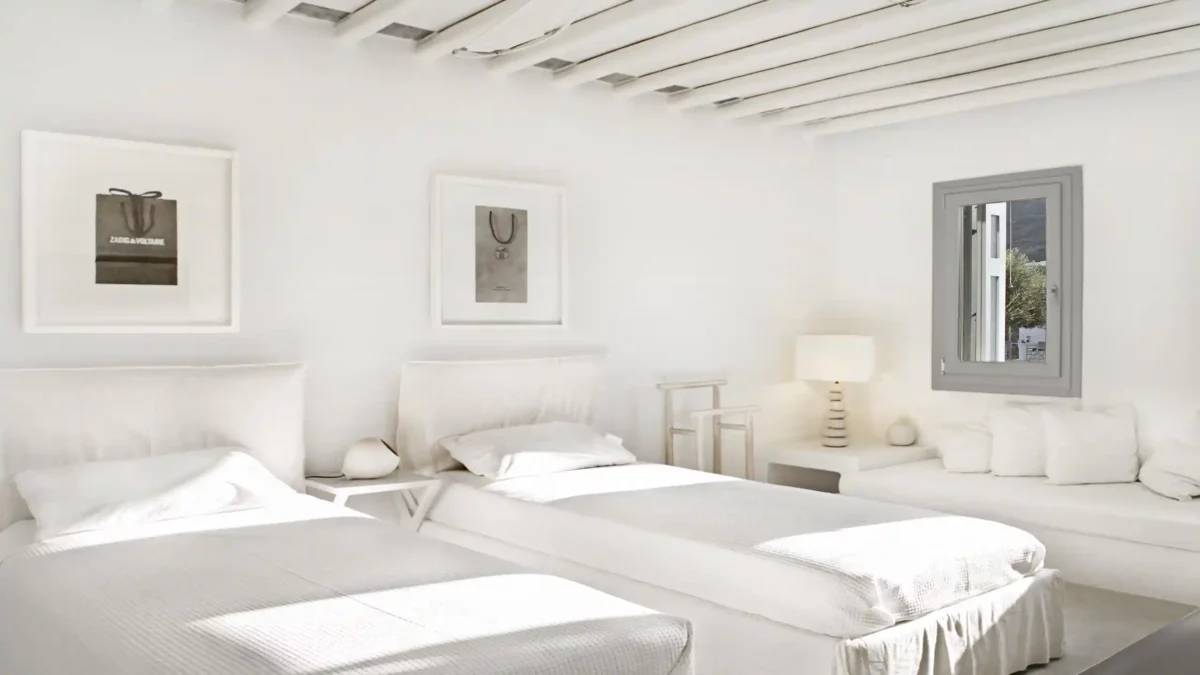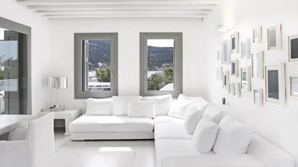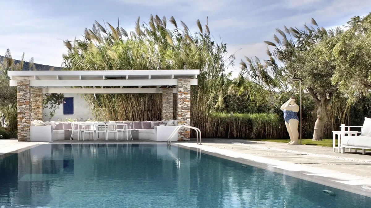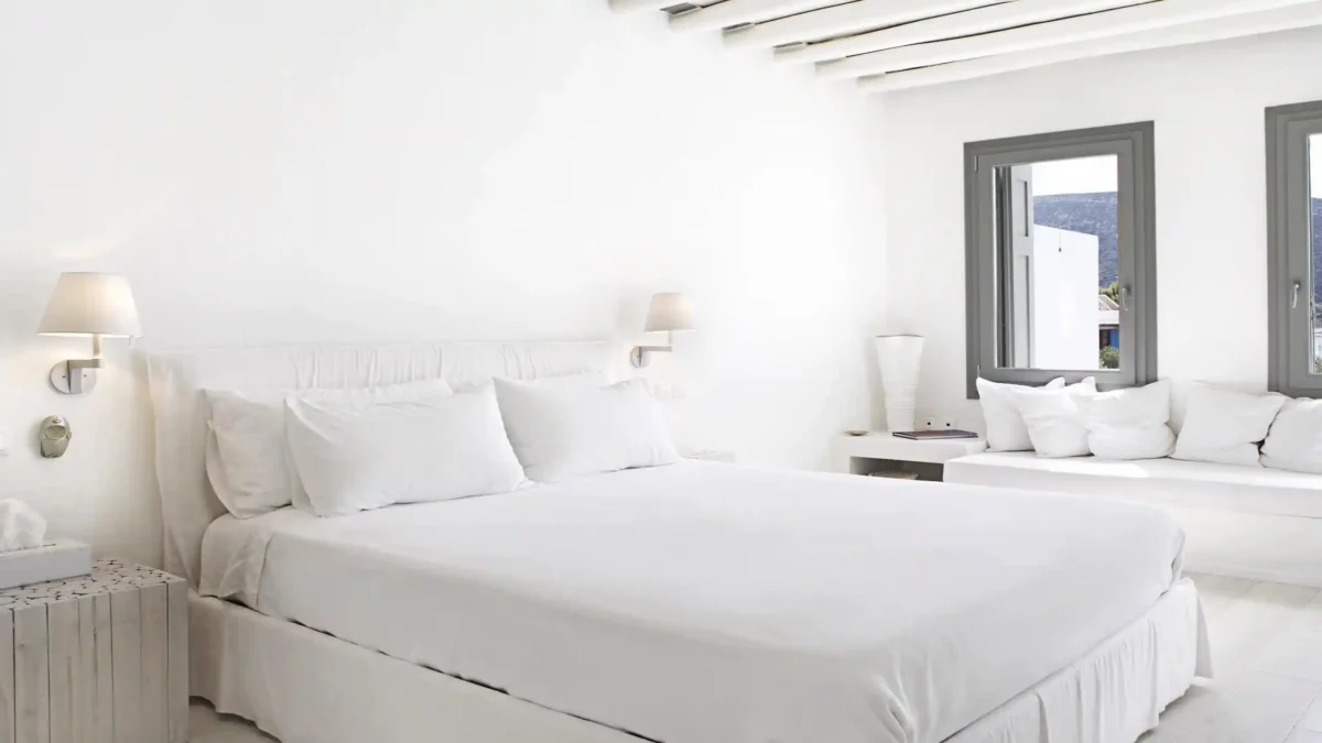 Conçue pour accueillir jusqu’à 18 personnes (830 m2), la propriété offre neuf chambres réparties harmonieusement entre les trois bâtiments. Les intérieurs, inspirés de l’architecture traditionnelle sifniote, associent lignes épurées et confort contemporain. Chaque suite dispose de sa salle de bain attenante et de la climatisation, assurant intimité et fluidité de séjour pour les grands groupes.