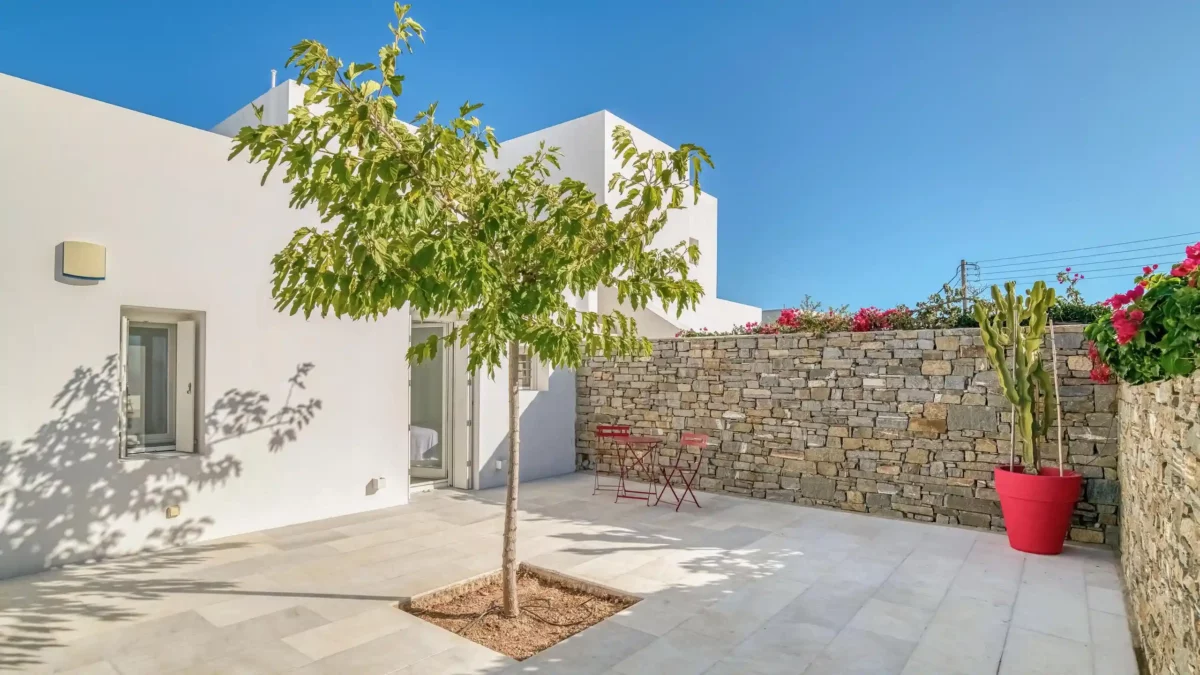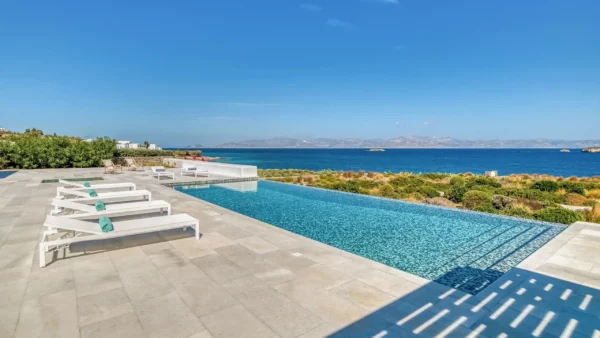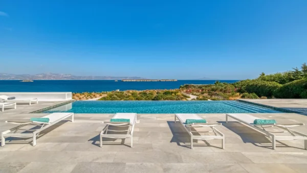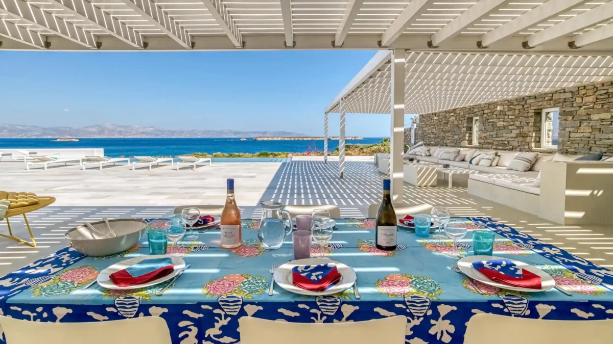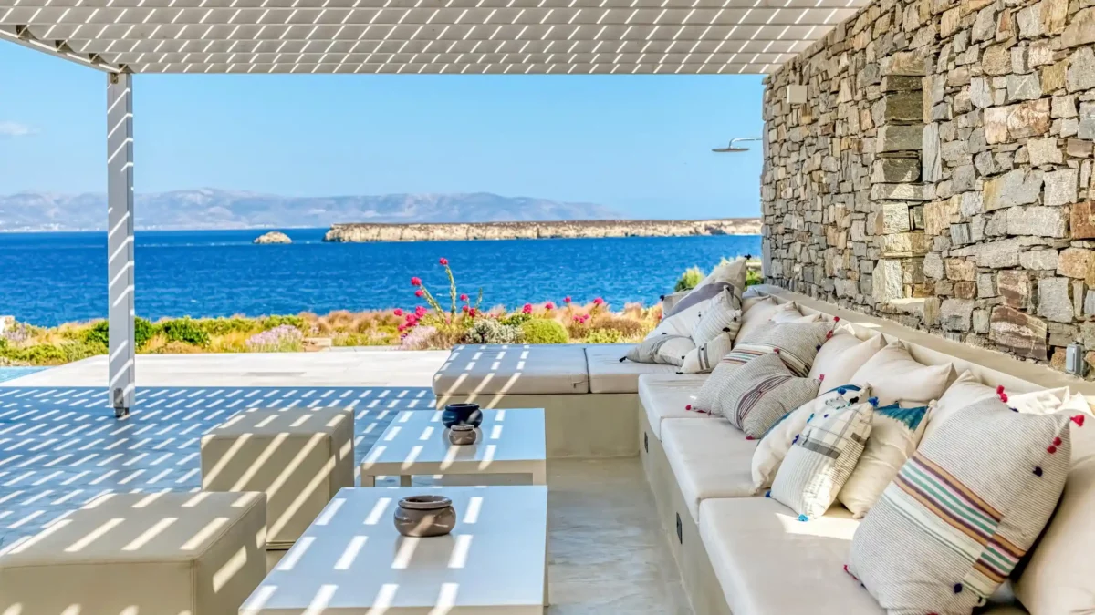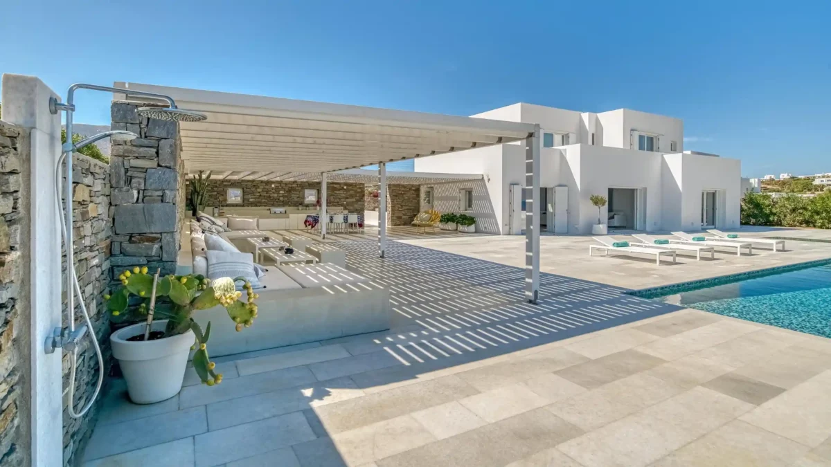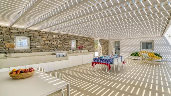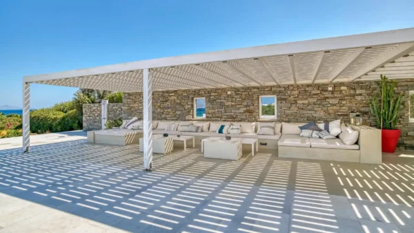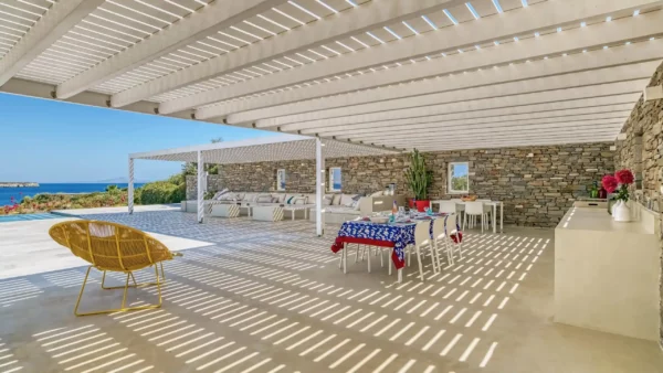 Les extérieurs sont à la fois accueillants et raffinés. Une piscine à débordement occupe le centre de la terrasse principale, créant un lien visuel direct avec l’horizon. Une vaste pergola typique de la tradition cycladique abrite un salon de jardin et un espace pour les repas. Ce cadre extérieur fait de Aktios un havre de paix où la mer sert de toile de fond permanente et spectaculaire.