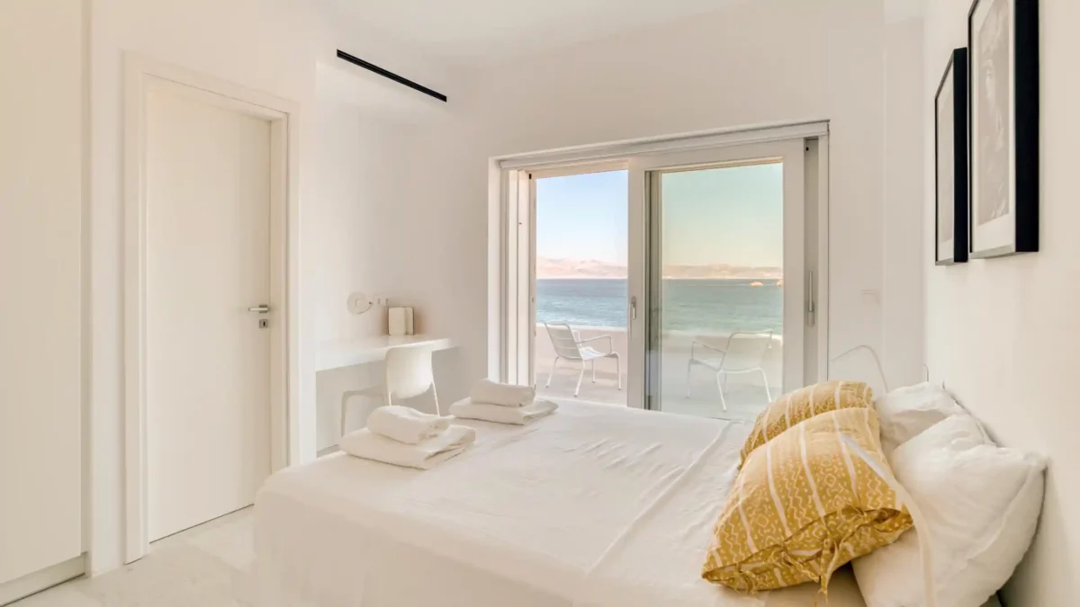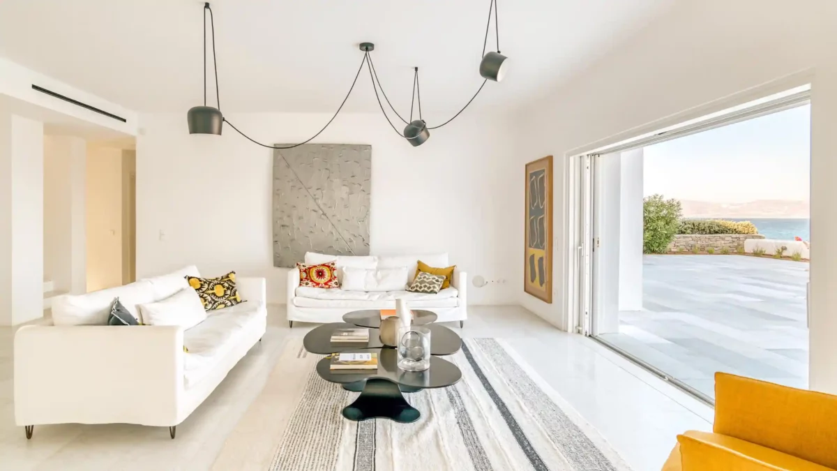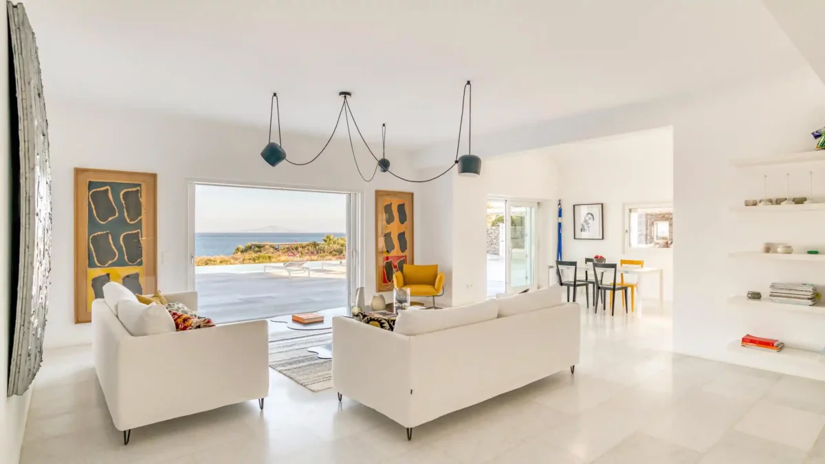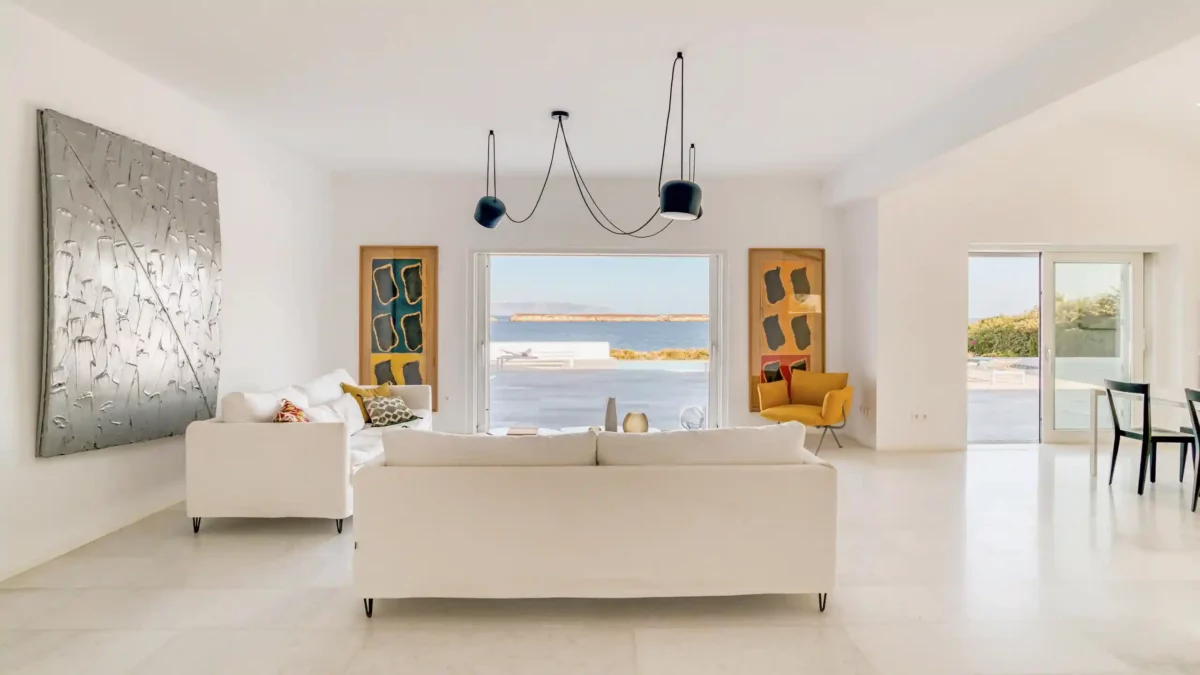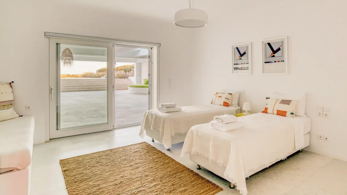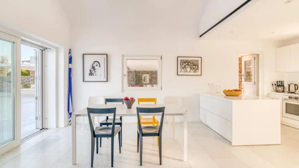 Côté intérieur, l’atmosphère est minimaliste et chaleureuse. Les tons blancs dominent l’espace, rehaussés par des meubles et des œuvres d’art soigneusement sélectionnés qui apportent du caractère à la demeure. De grandes portes-fenêtres s’ouvrent sur l’extérieur depuis les espaces communs et les chambres confortables réparties sur les 3 niveaux. Aktios réussit l’équilibre parfait entre un design moderne et une connexion intime avec la nature environnante.
