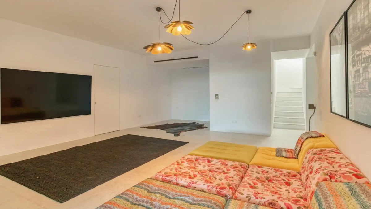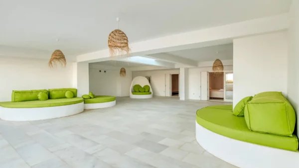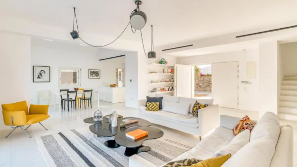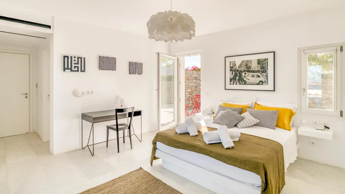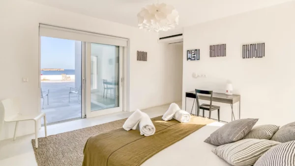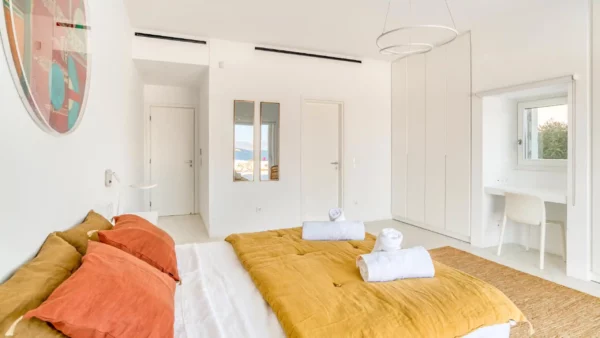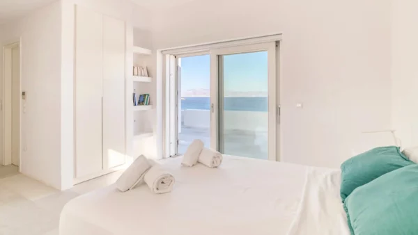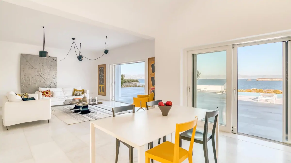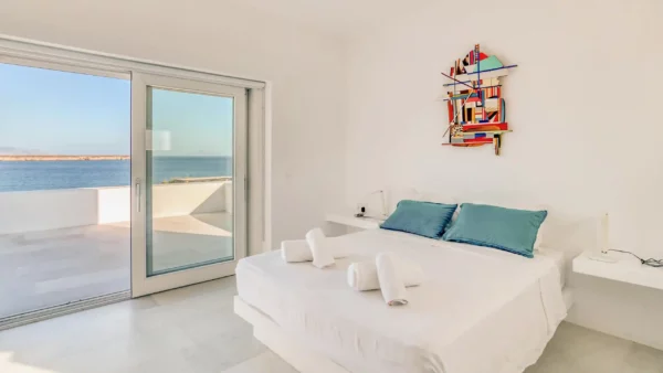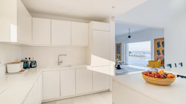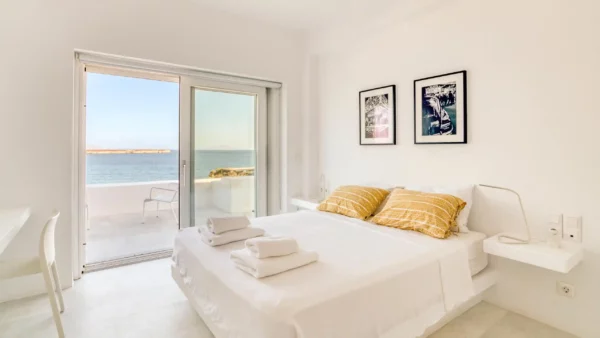 Côté intérieur, l’atmosphère est minimaliste et chaleureuse. Les tons blancs dominent l’espace, rehaussés par des meubles et des œuvres d’art soigneusement sélectionnés qui apportent du caractère à la demeure. De grandes portes-fenêtres s’ouvrent sur l’extérieur depuis les espaces communs et les chambres confortables réparties sur les 3 niveaux. Aktios réussit l’équilibre parfait entre un design moderne et une connexion intime avec la nature environnante.