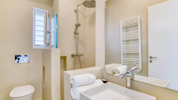 MAISON PRINCIPALE – 10 personnes – Niveau entrée : 2 chambres d’amis (lit double ; climatisation) ; salles de bain attenantes (douche) ; accès direct à la terrasse de la piscine ; vue mer. Niveau supérieur : 2 chambres d’amis (lit double ; climatisation) ; salles de bain attenantes (douche) ; balcon partagé avec vue mer. Niveau inférieur : 1 chambre d’amis (lits jumeaux joignables ; climatisation) ; salle de bain attenante avec (douche) ; accès direct vers l’extérieur.