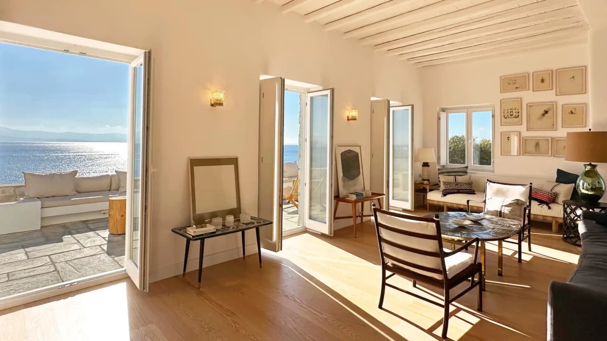 Les espaces extérieurs de Artista sont pensés pour optimiser les vues panoramiques. Des canapés et coussins confortables sont disposés pour se détendre au soleil avec la mer en toile de fond, aux côtés d’une salle à manger ombragée par deux grands parasols. Le charme de la propriété est complété par une petite piscine nichée au bord de l’eau, presque cachée parmi les rochers, offrant un lieu idéal pour se relaxer.