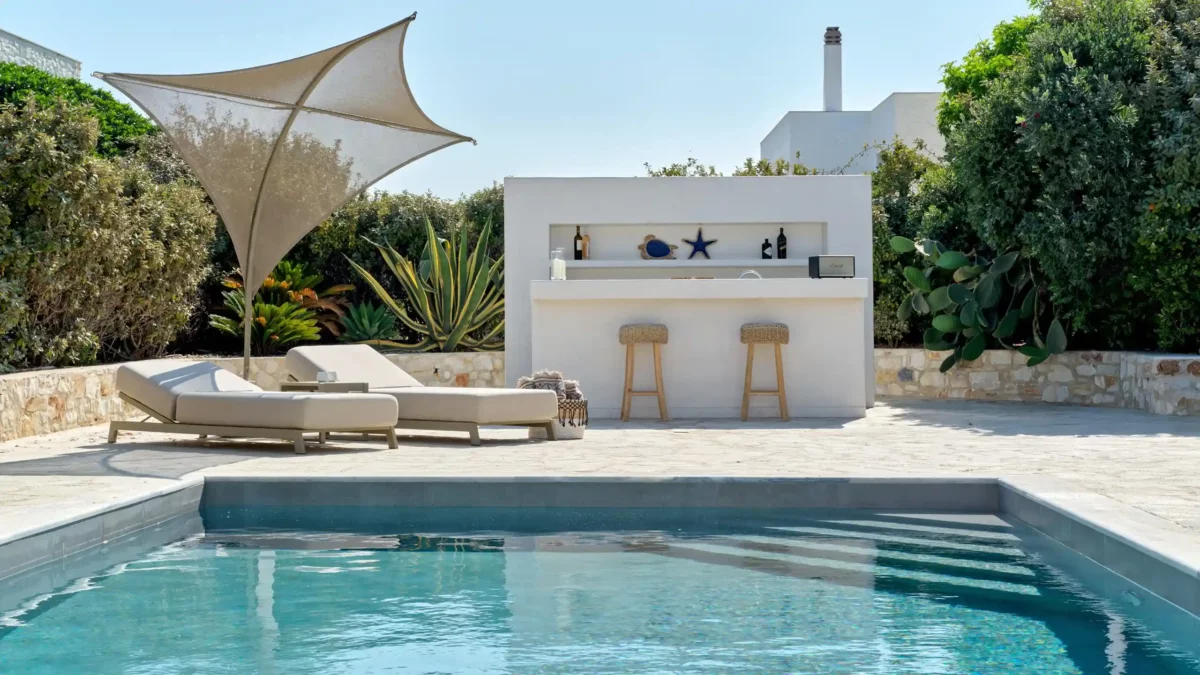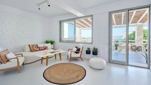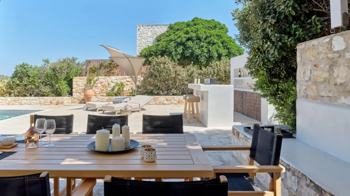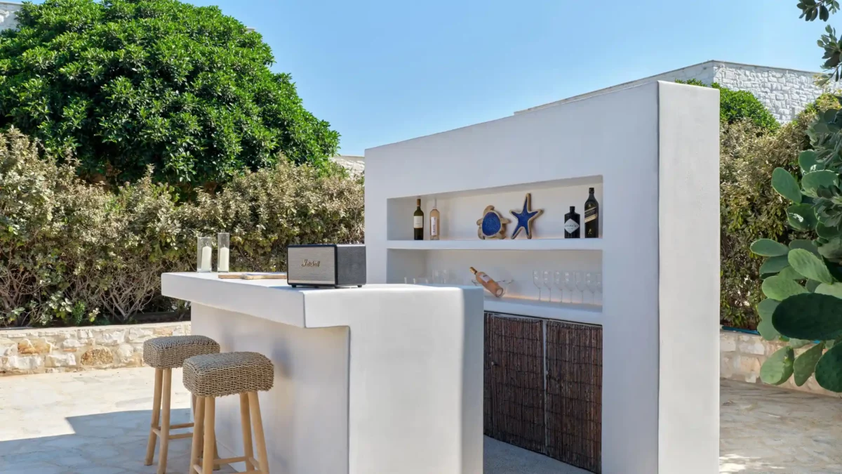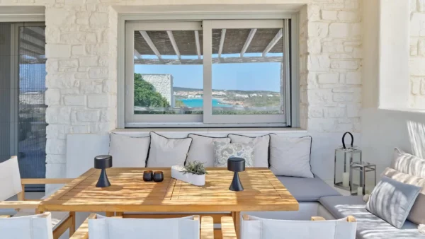 Sansa se distingue par sa position dominante en front de mer et sa capacité d’accueil de 12 personnes, idéale pour les grandes familles. Avec ses 6 chambres et ses espaces extérieurs complets incluant un bar de piscine, elle favorise la convivialité. Sa localisation à Santa Maria permet de profiter du calme tout en restant à moins de 4 km de Naoussa.