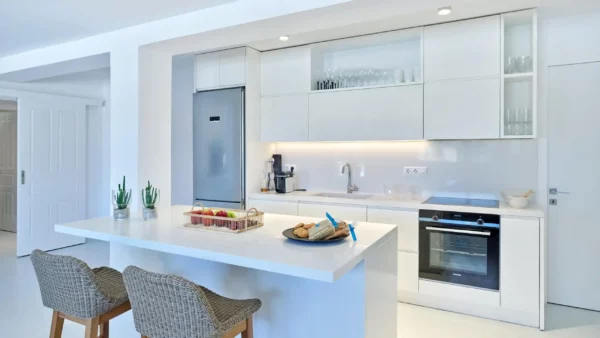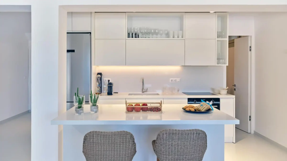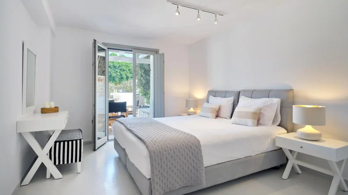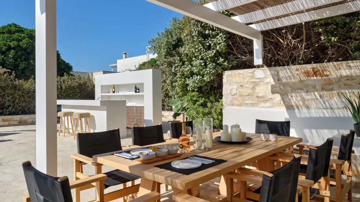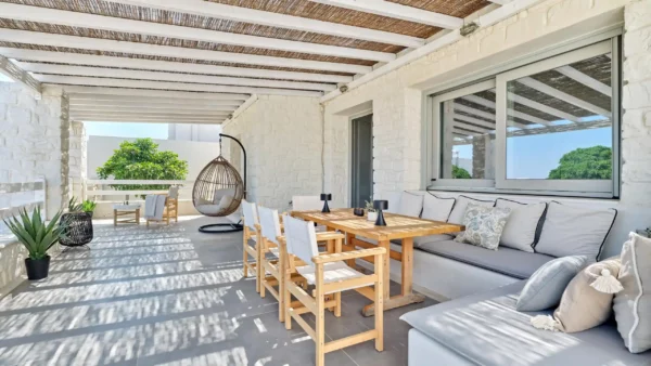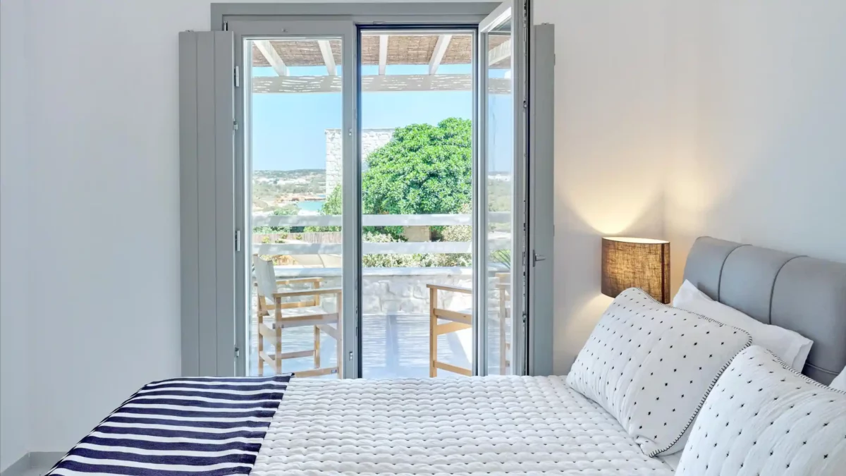 Sansa se distingue par sa position dominante en front de mer et sa capacité d’accueil de 12 personnes, idéale pour les grandes familles. Avec ses 6 chambres et ses espaces extérieurs complets incluant un bar de piscine, elle favorise la convivialité. Sa localisation à Santa Maria permet de profiter du calme tout en restant à moins de 4 km de Naoussa.