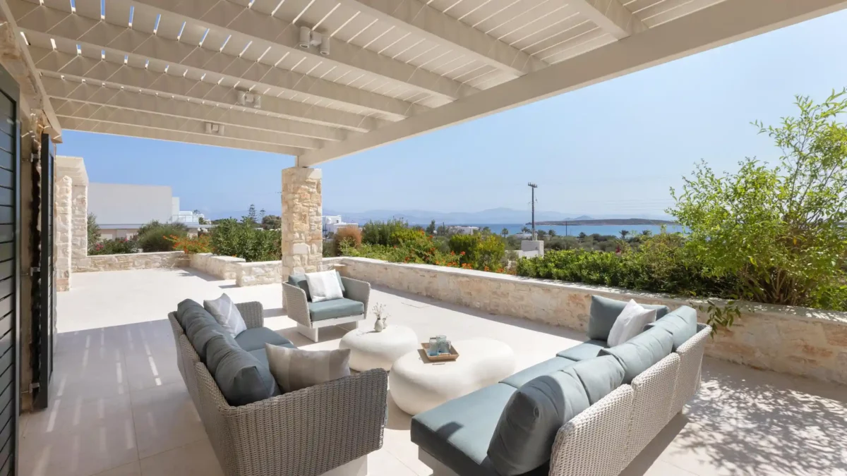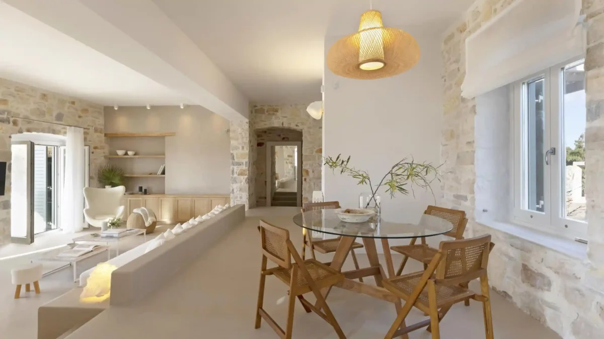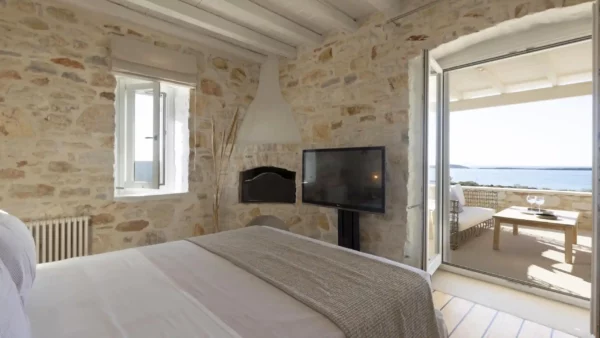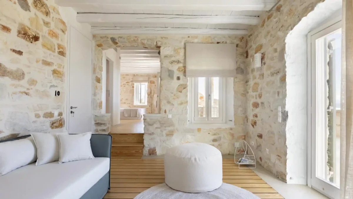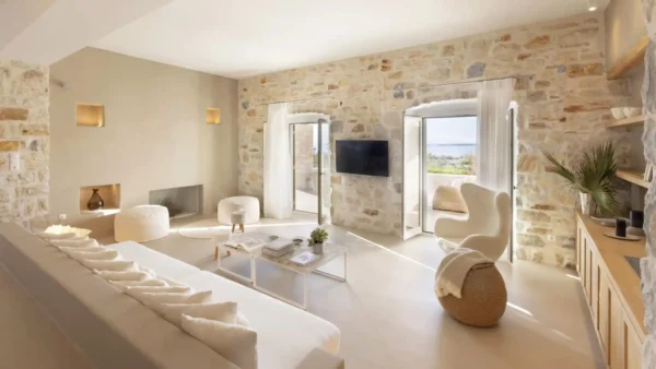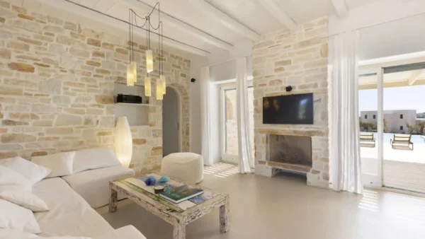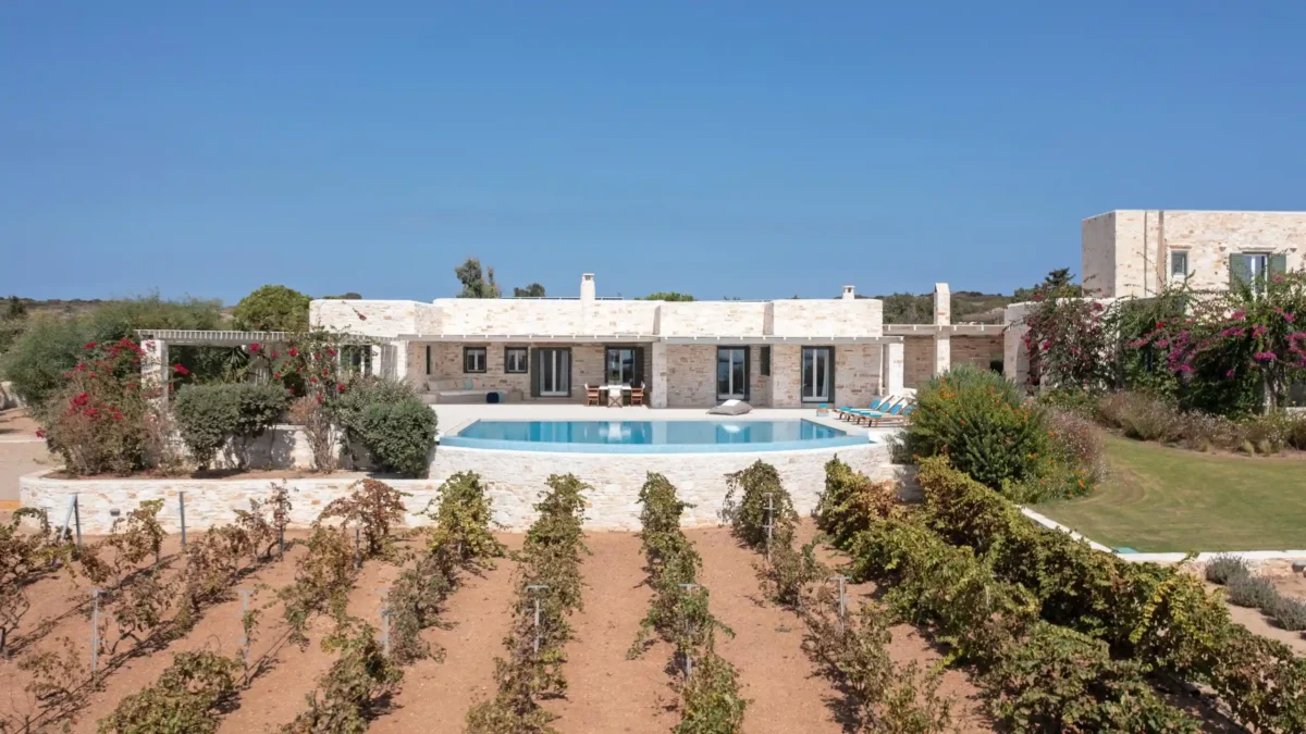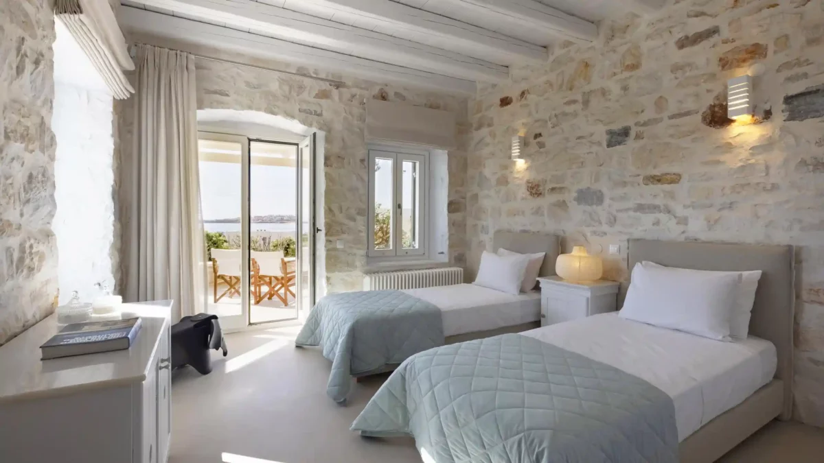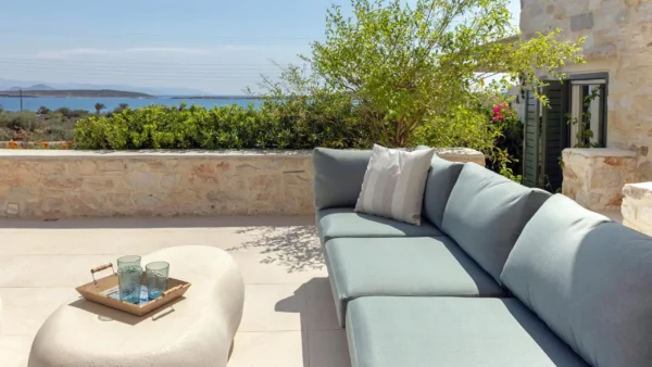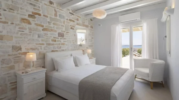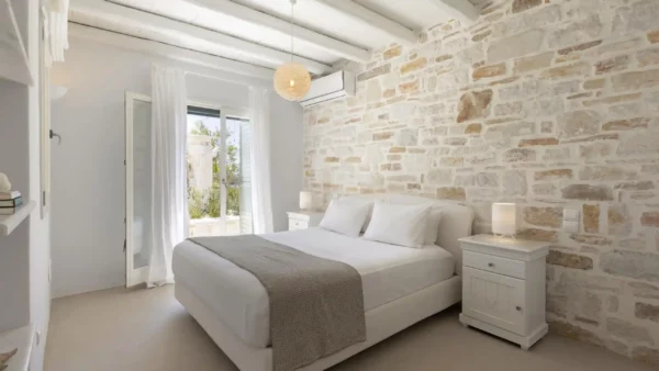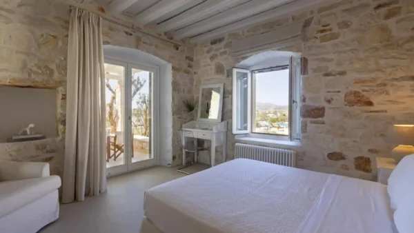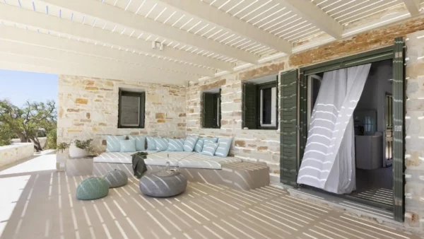 Déployée sur 600 m², Sienna se compose d’une maison principale et d’une maison d’amis indépendante. Son architecture respecte les codes cycladiques avec murs en pierre locale et volumes blancs épurés. L’ensemble profite d’un environnement calme, tout en restant proche des principales animations de la région.