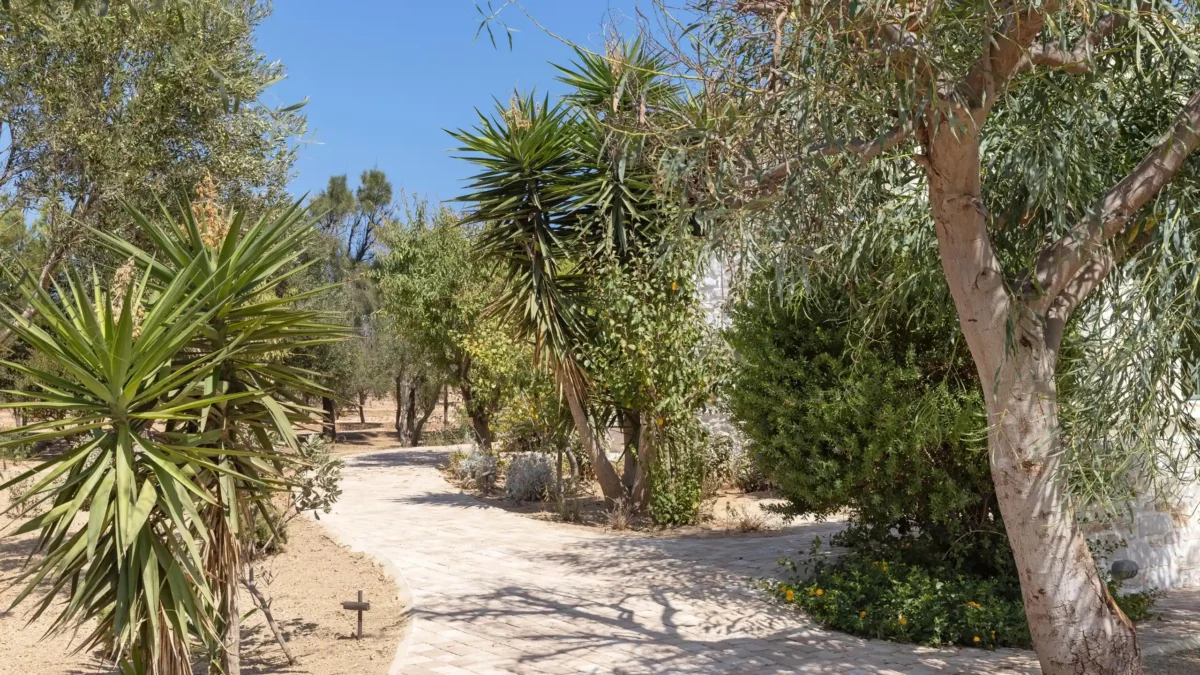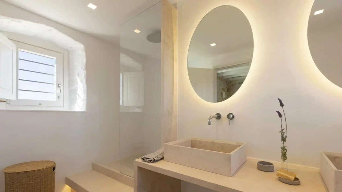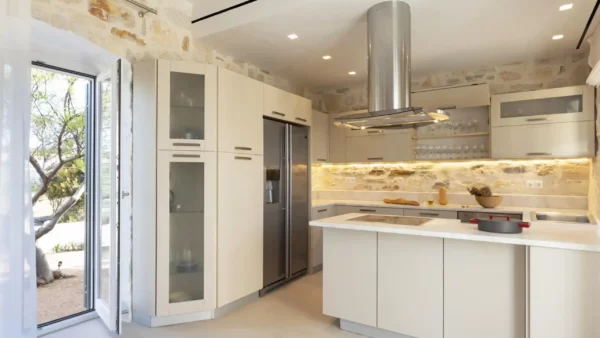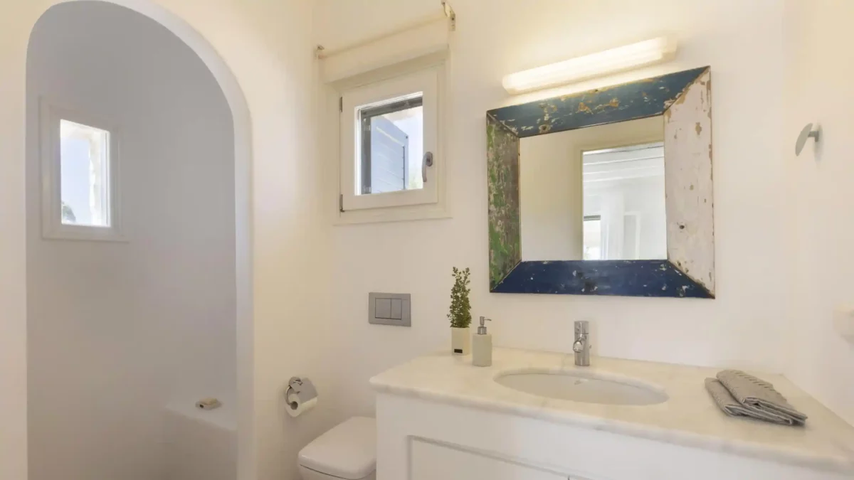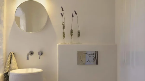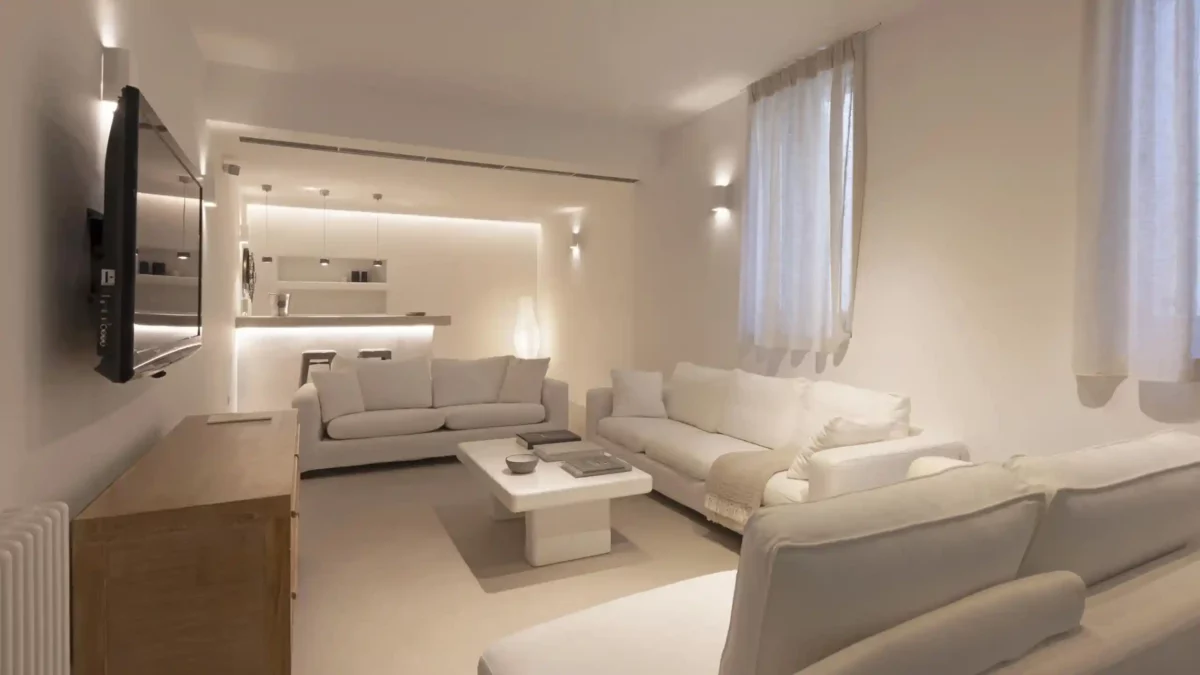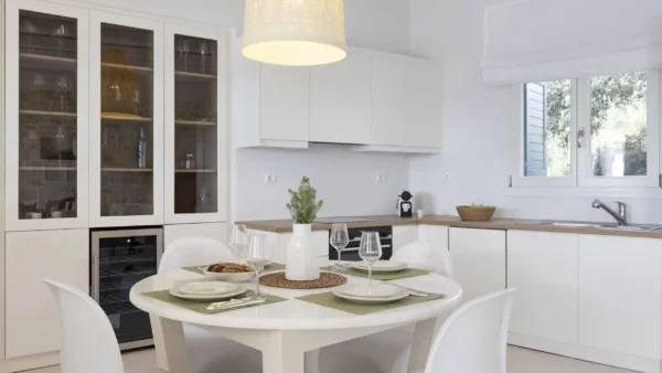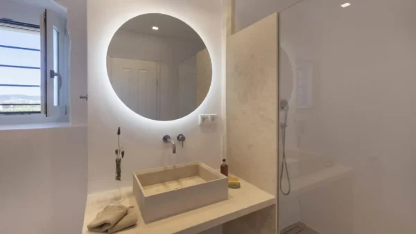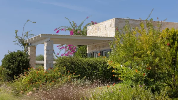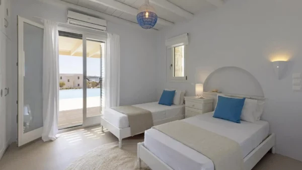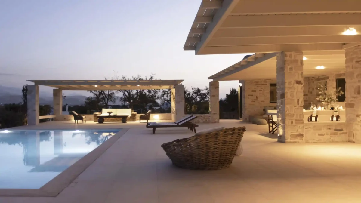 Déployée sur 600 m², Sienna se compose d’une maison principale et d’une maison d’amis indépendante. Son architecture respecte les codes cycladiques avec murs en pierre locale et volumes blancs épurés. L’ensemble profite d’un environnement calme, tout en restant proche des principales animations de la région.