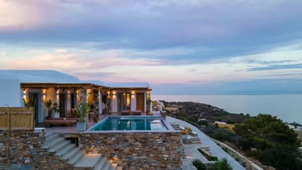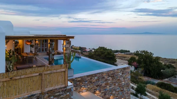 The Captain’s Lookout est une propriété contemporaine nouvellement construite, idéalement située à Megas Gialos, au sud de l’île de Syros. Déployée sur 300 m², cette villa offre une élégance minimaliste et une atmosphère apaisante face à la mer Égée. Son architecture moderne épouse parfaitement le paysage, avec des piscines à débordement semblant se fondre dans l’horizon et offrant une vue mer totalement dégagée.