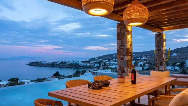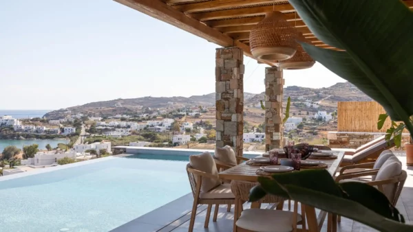 Villa d’exception avec deux piscines privées, salle de sport et vues panoramiques à Megas Gialos.