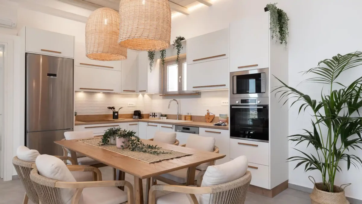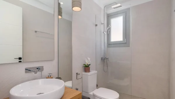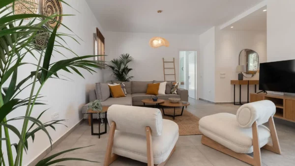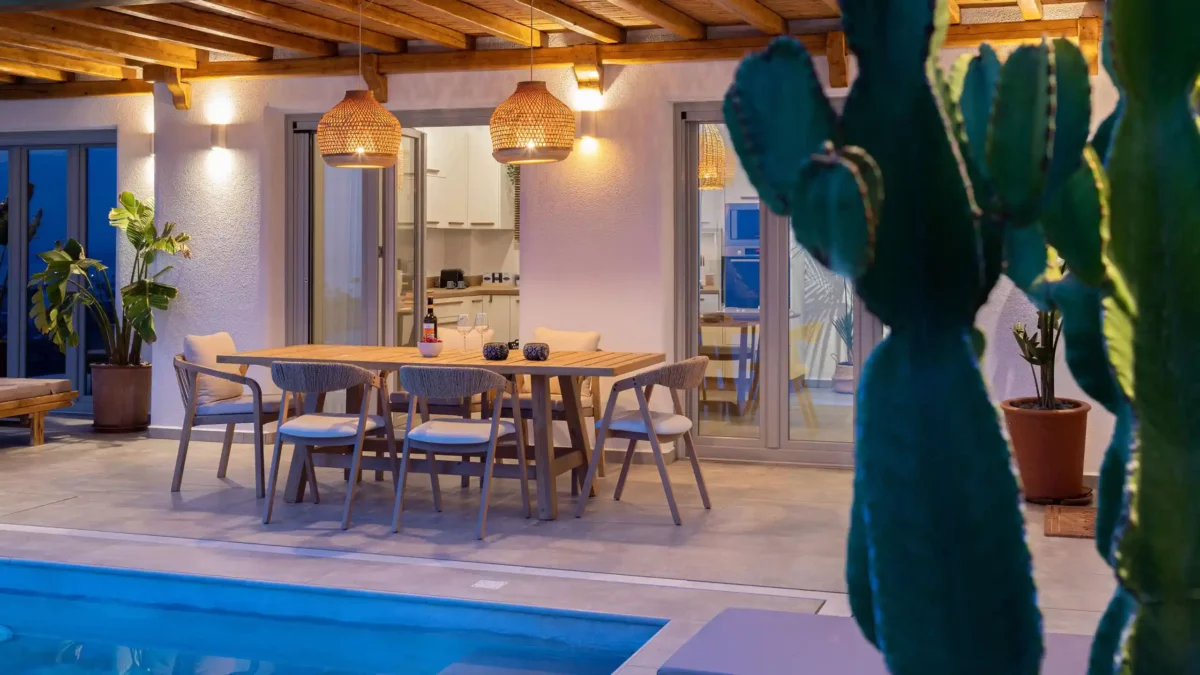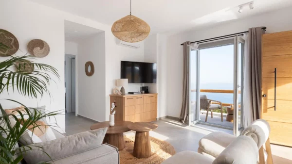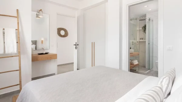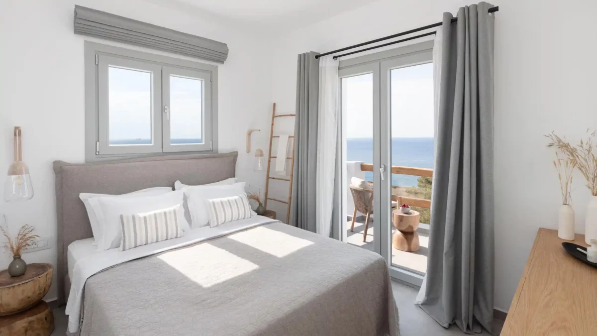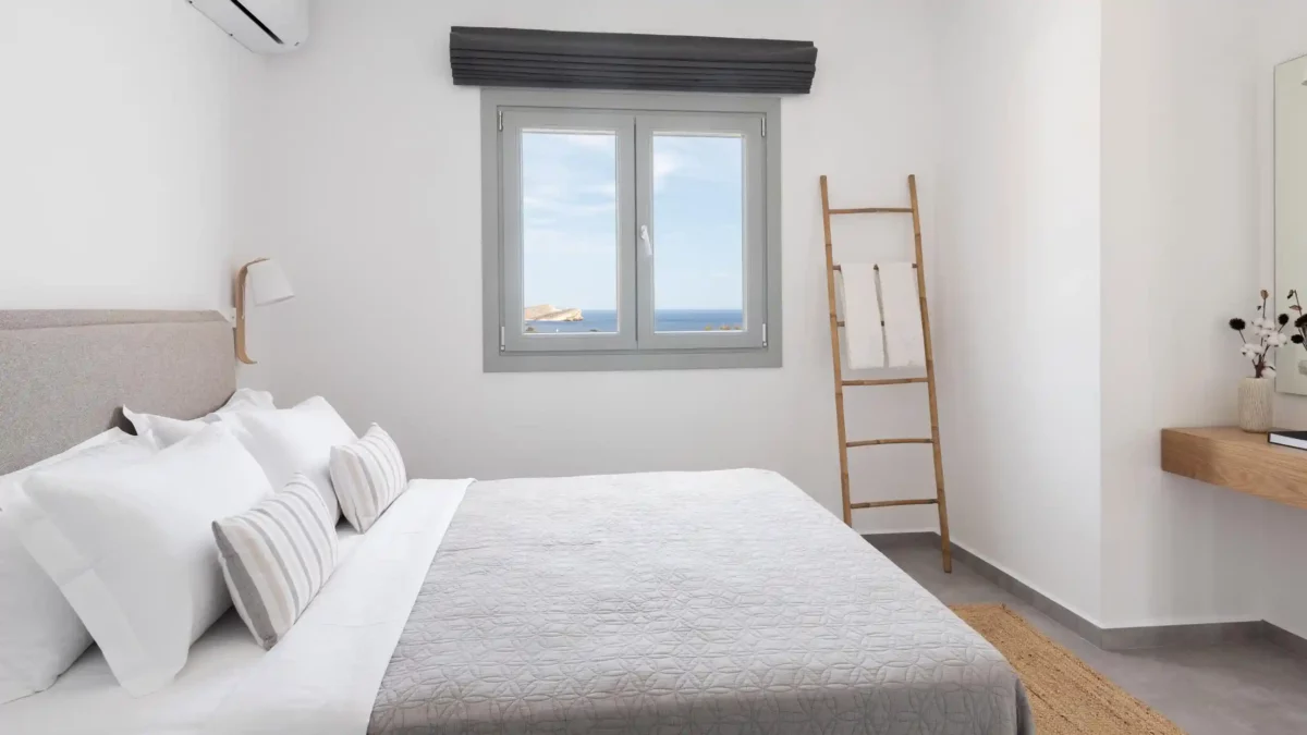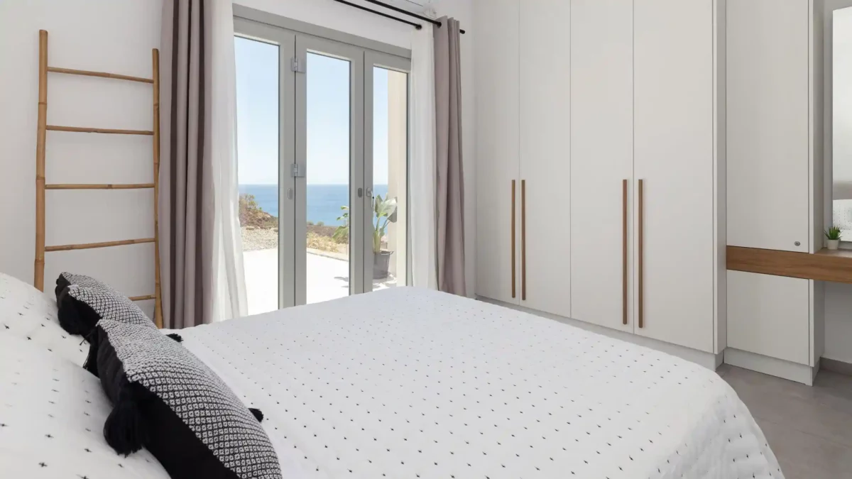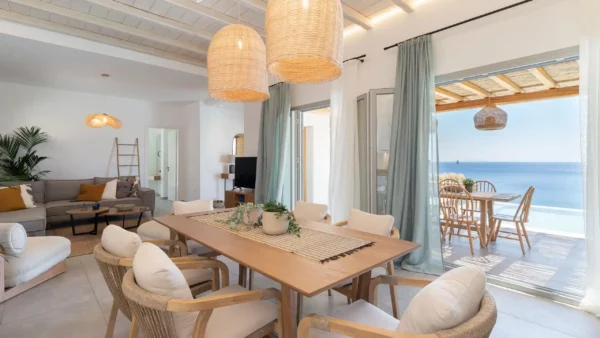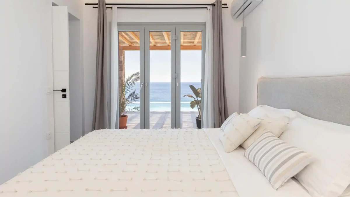 Pensée pour accueillir jusqu’à 14 personnes, la propriété se compose de deux ailes indépendantes — East Villa et West Villa — pouvant être réservées séparément ou ensemble. Les espaces intérieurs, entièrement climatisés, allient lignes épurées et confort contemporain. Chaque chambre bénéficie d’une vue mer ou d’un accès privilégié aux extérieurs, permettant de vivre pleinement l’expérience méditerranéenne.