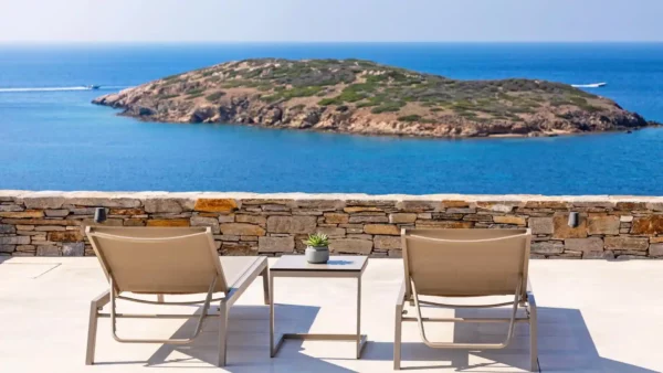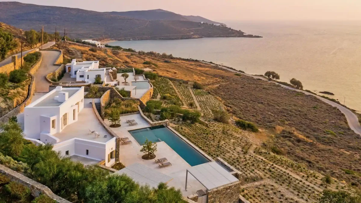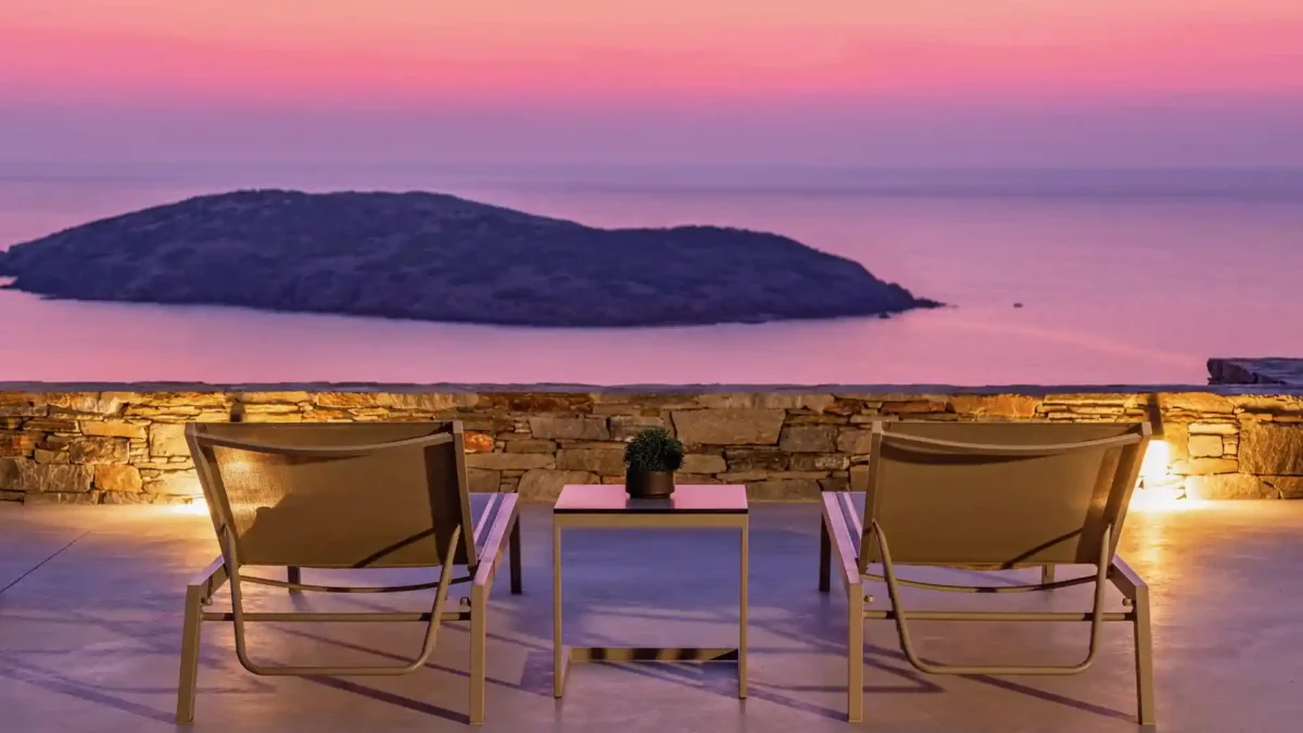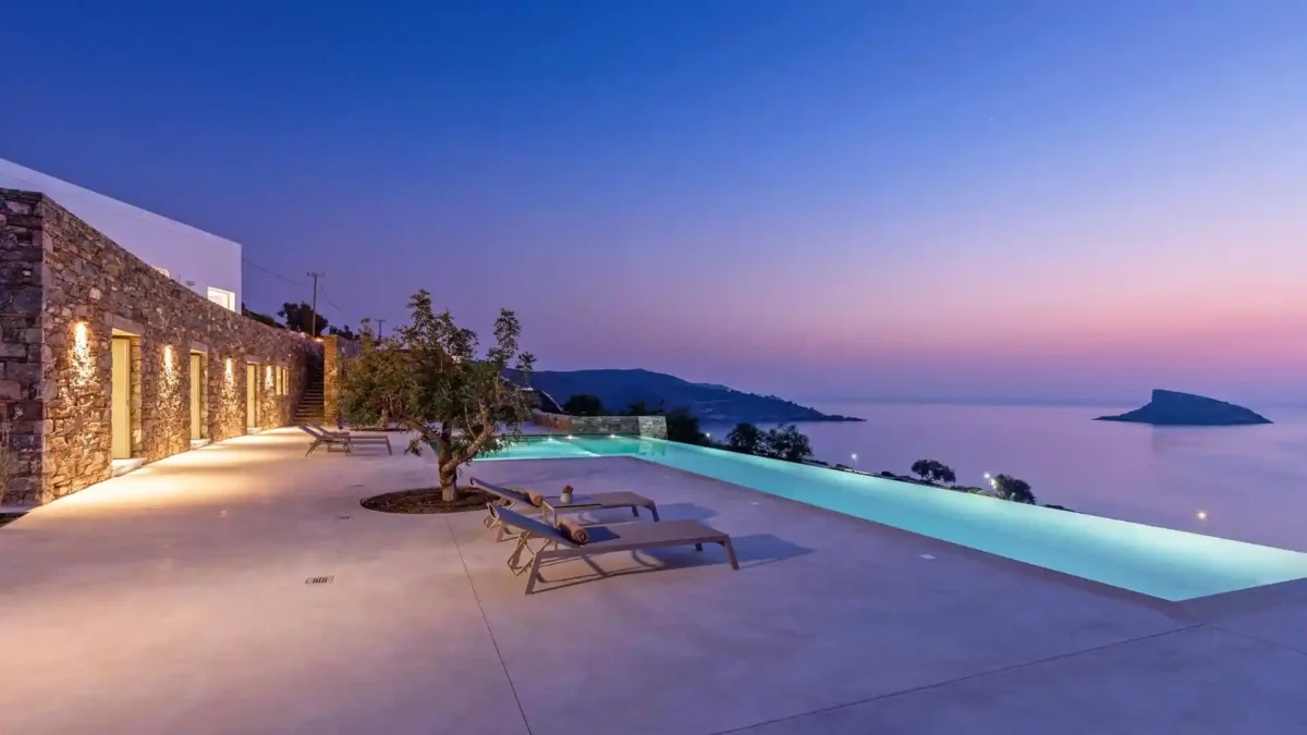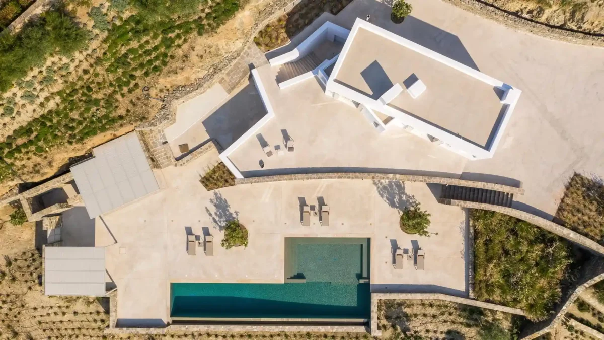 Villa Lewis se situe à Komito, sur la côte sud de l’île de Syros, à quelques pas du village de Poseidonia. Véritable chef-d’œuvre architectural signé Giorgos Evripiotis, la villa suit les lignes naturelles du littoral. Elle offre à ses hôtes des vues fascinantes sur la mer Égée et les îlots environnants. D’une superficie de 280 m², elle constitue un sanctuaire serein où l’horizon devient chaque soir le théâtre de couchers de soleil spectaculaires.