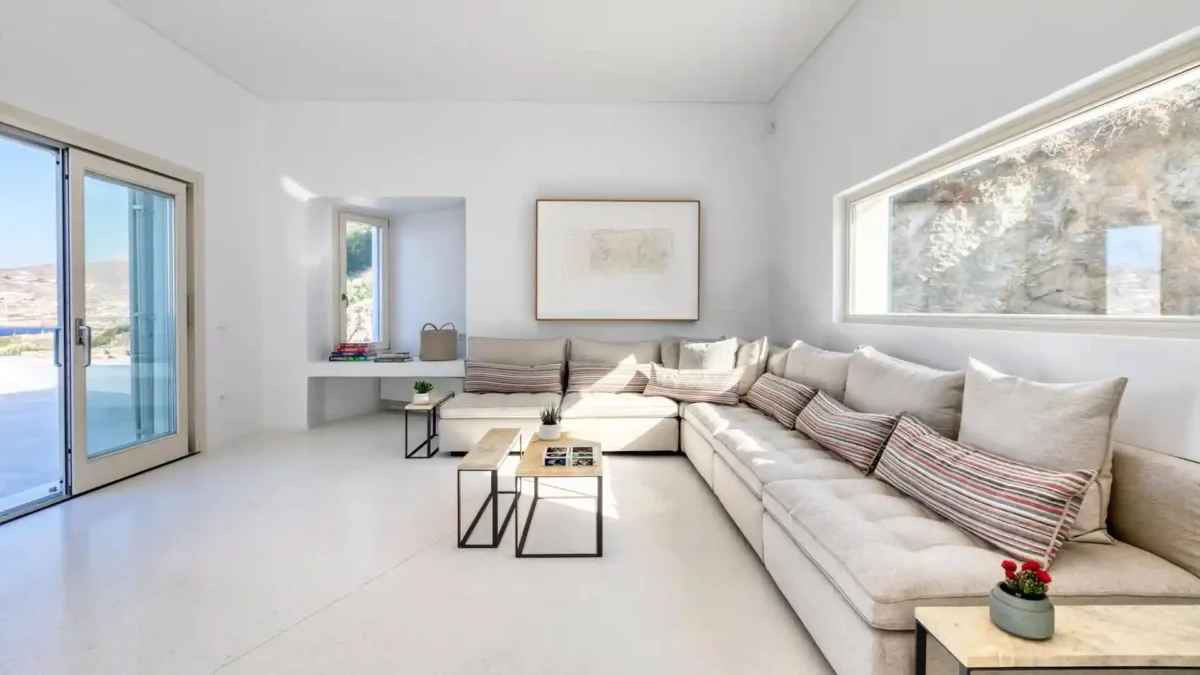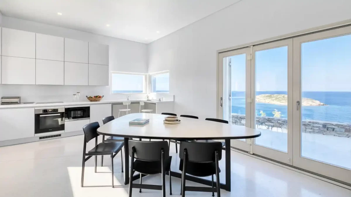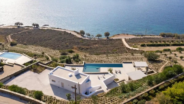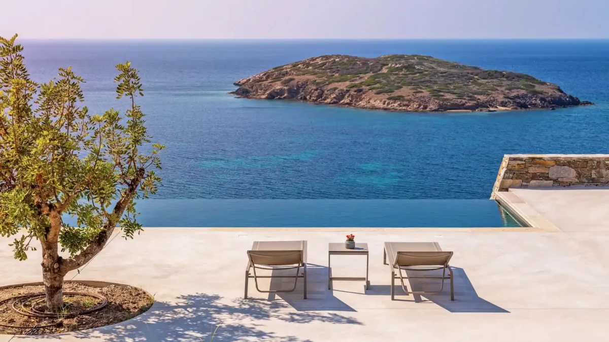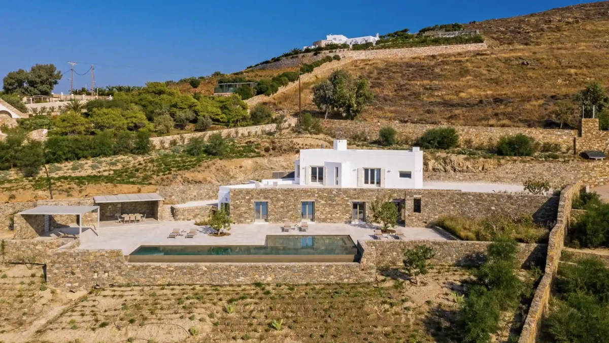 Villa Lewis se situe à Komito, sur la côte sud de l’île de Syros, à quelques pas du village de Poseidonia. Véritable chef-d’œuvre architectural signé Giorgos Evripiotis, la villa suit les lignes naturelles du littoral. Elle offre à ses hôtes des vues fascinantes sur la mer Égée et les îlots environnants. D’une superficie de 280 m², elle constitue un sanctuaire serein où l’horizon devient chaque soir le théâtre de couchers de soleil spectaculaires.
