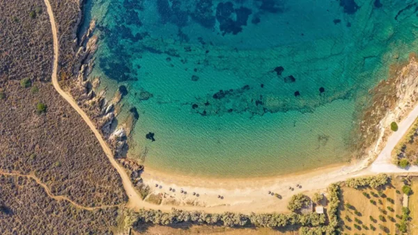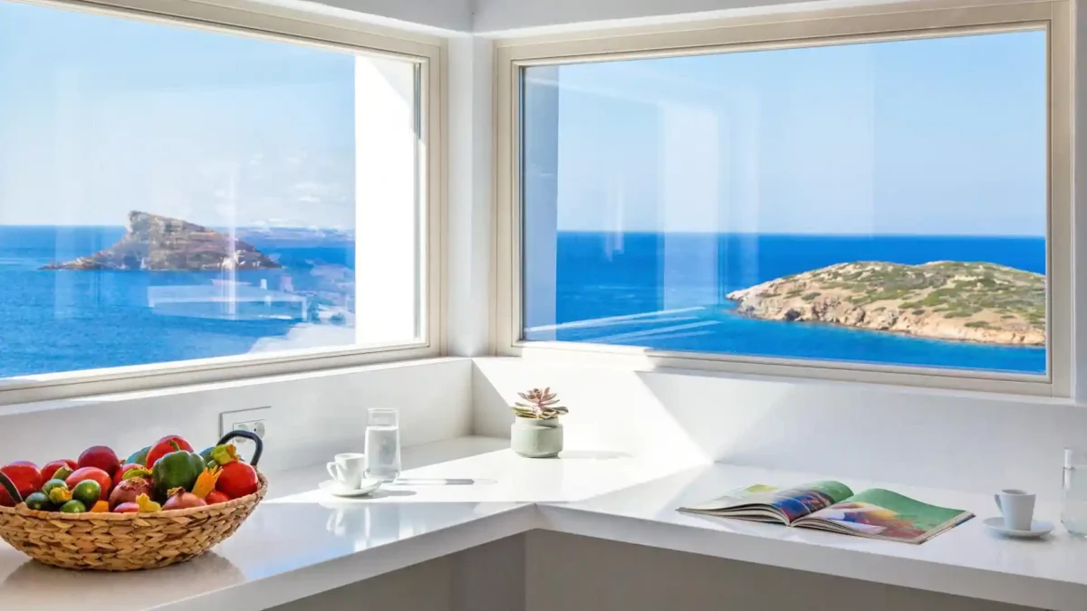 Syros. Plage de Komito : 600 m (accessible à pied). Plage d’Agathopes : 1,4 km. Poseidonia : 1,5 km. Finikas : 3 km. Ermoupoli & Port : 11,5 km. Aéroport de Syros (JSY) : 11 km.