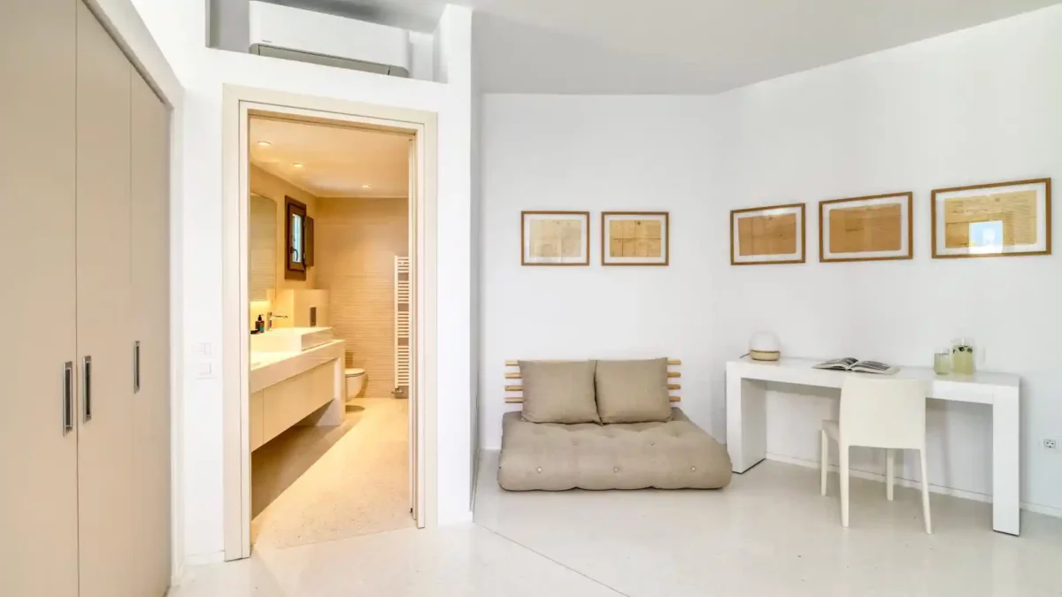 MAISON PRINCIPALE – 8 personnes – Niveau inférieur / Piscine : 1 chambre Master (lit Super King Size ; climatisation ; ventilateur de plafond) ; salle de bain attenante (douche) ; espace bureau et vue mer. 2 chambre d’amis (lit King Size ; climatisation ; ventilateur de plafond) ; salles de bains attenantes (douche) ; bureau ; 1 avec vue mer ; la seconde avec petit accès petit extérieur. 1 chambre d’amis (lits jumeaux ; climatisation ; ventilateur de plafond) ; salle de bain attenante (douche) ; bureau et vue mer.