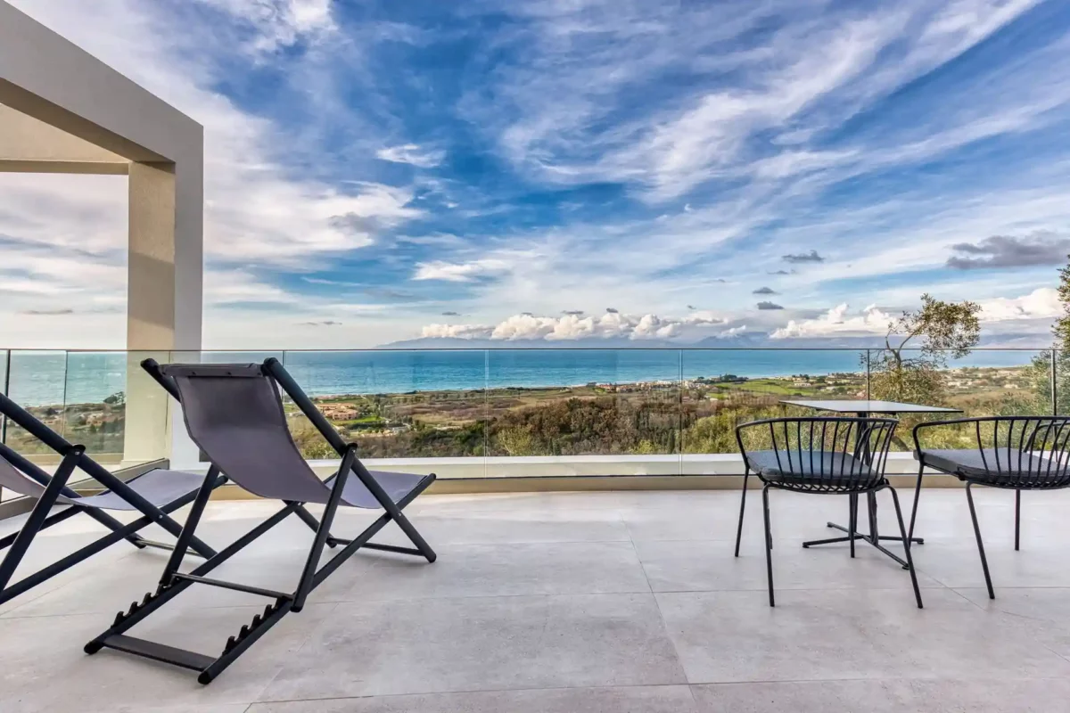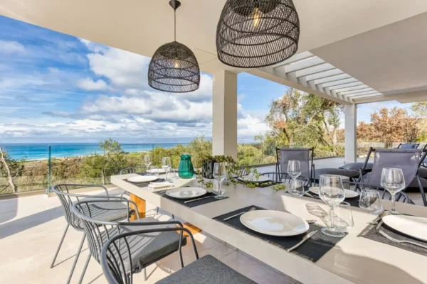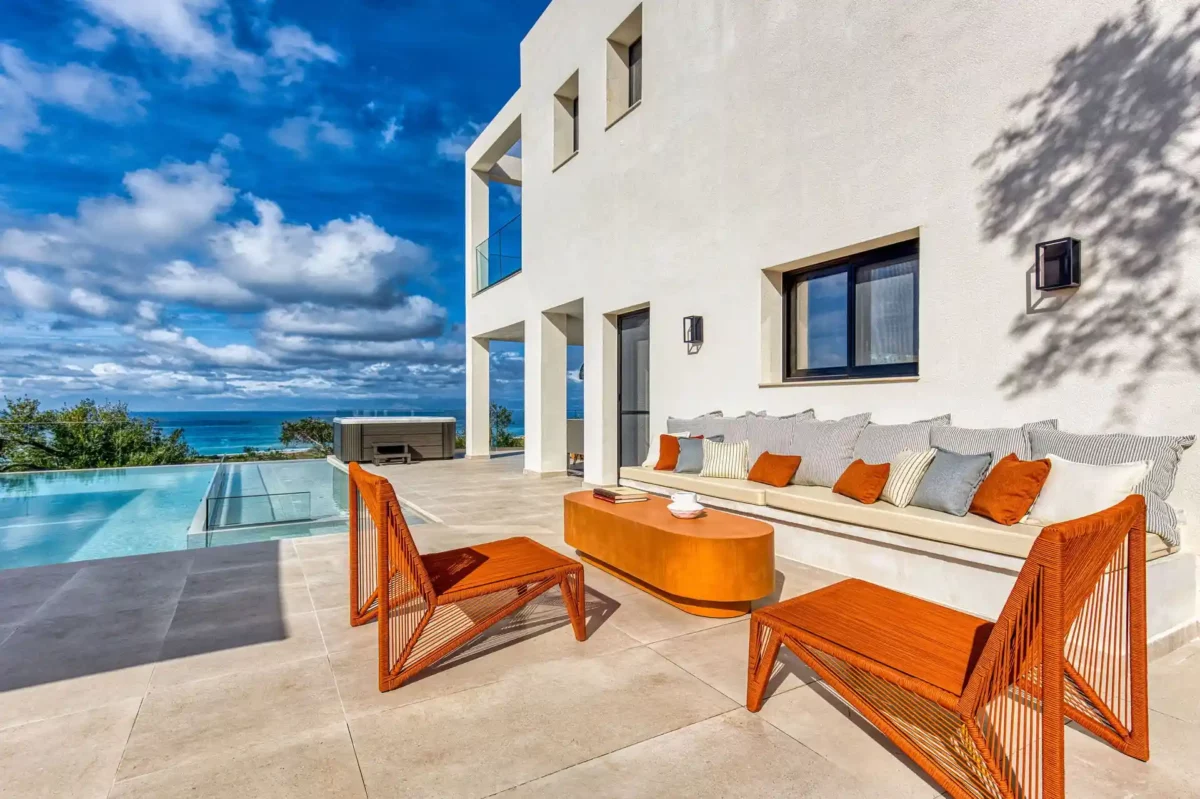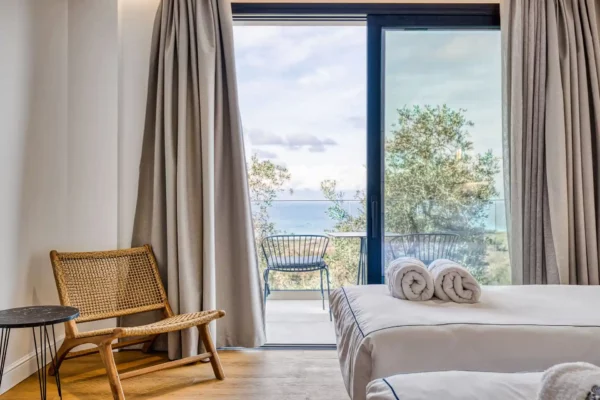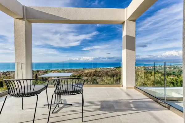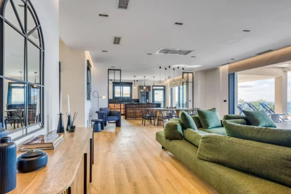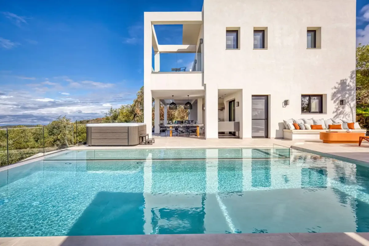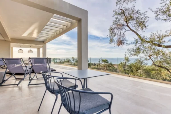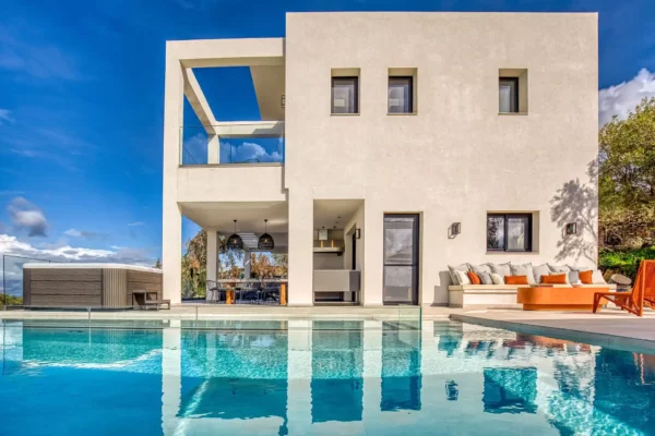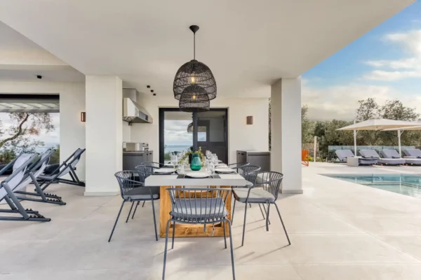 Villa Dominante est une villa récente située sur la côte nord de Corfou. Récemment achevée, elle bénéficie d’une position surélevée offrant une vue panoramique sur la mer et la campagne environnante.