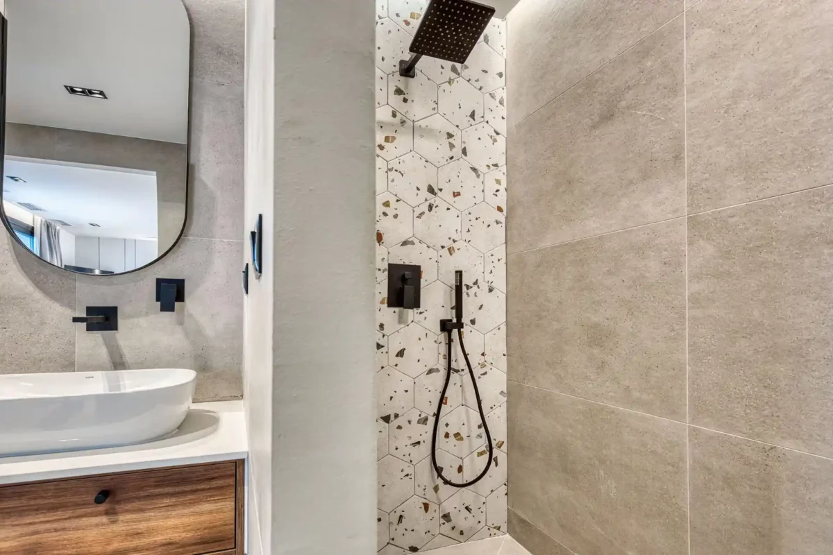 Rez-de-chaussée : vaste séjour avec coin repas et cuisine ; WC ; chambre double avec salle de bain privée (douche). Premier étage : 2 chambres doubles chacune avec salle de bain privée (douche) ; 1 chambre double avec salle de bain privée (douche).