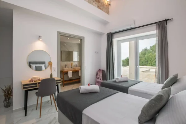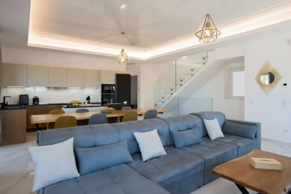 Les extérieurs de Villa Sunset permettent de profiter pleinement de son emplacement dominant. La piscine privée à débordement (10,5 x 5,5 m) comprend une zone peu profonde adaptée aux enfants ainsi qu’une zone plus profonde. Les vastes terrasses sont aménagées pour les repas en plein air et la détente, avec une vue dégagée sur la mer et les couchers de soleil. Un jardin privé et un barbecue complètent les équipements extérieurs.