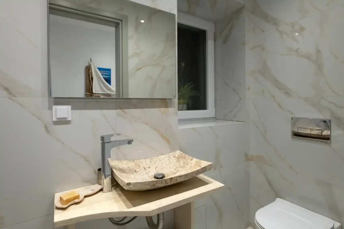 Rez-de-chaussée : vaste espace de vie lumineux composé d’un salon (Smart TV) avec coin repas et cuisine (four ; congélateur ; réfrigérateur ; lave-vaisselle ; micro-ondes ; cafetière espresso ; cafetière américaine ; grille-pain) ; WC ; 1 chambre double avec salle de bain privée (douche). Premier étage : 2 chambres doubles, chacune avec salle de bain privée (douche). Niveau inférieur (accessible depuis l’intérieur et l’extérieur) : espace spa avec bain à remous circulaire (diamètre 2 m ; 6 places ; chauffé jusqu’à 36 °C) ; salle de bain (douche) ; canapé-lit double. Air conditionné dans toutes les pièces.