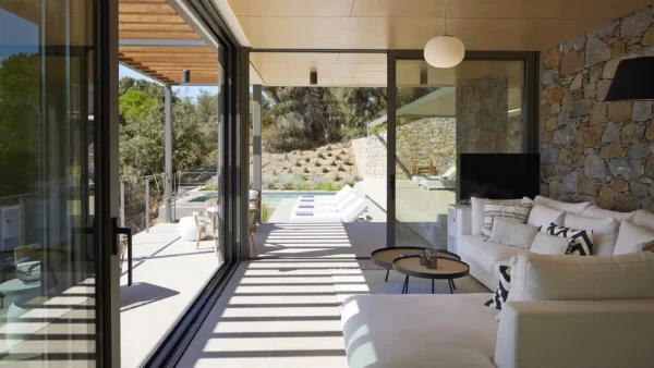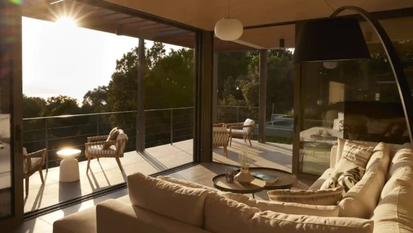 De larges baies vitrées coulissantes renforcent la continuité entre intérieur et extérieur, reliant salon et cuisine à la terrasse principale. Les intérieurs d’Olive Two présentent une atmosphère moderne et fonctionnelle, avec des équipements technologiques complets. Les espaces sont bien organisés et les chambres, réparties sur deux niveaux, offrent un niveau de confort homogène.