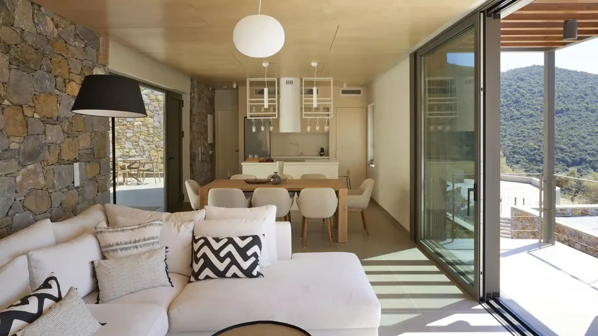 De larges baies vitrées coulissantes renforcent la continuité entre intérieur et extérieur, reliant salon et cuisine à la terrasse principale. Les intérieurs d’Olive Two présentent une atmosphère moderne et fonctionnelle, avec des équipements technologiques complets. Les espaces sont bien organisés et les chambres, réparties sur deux niveaux, offrent un niveau de confort homogène.