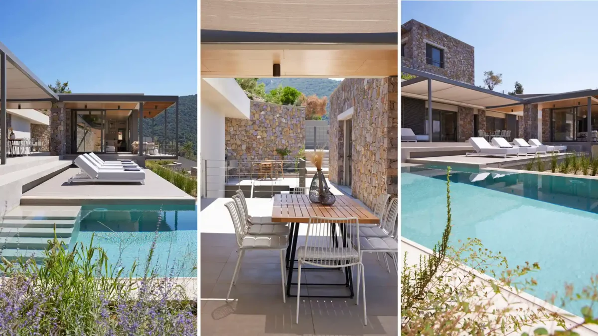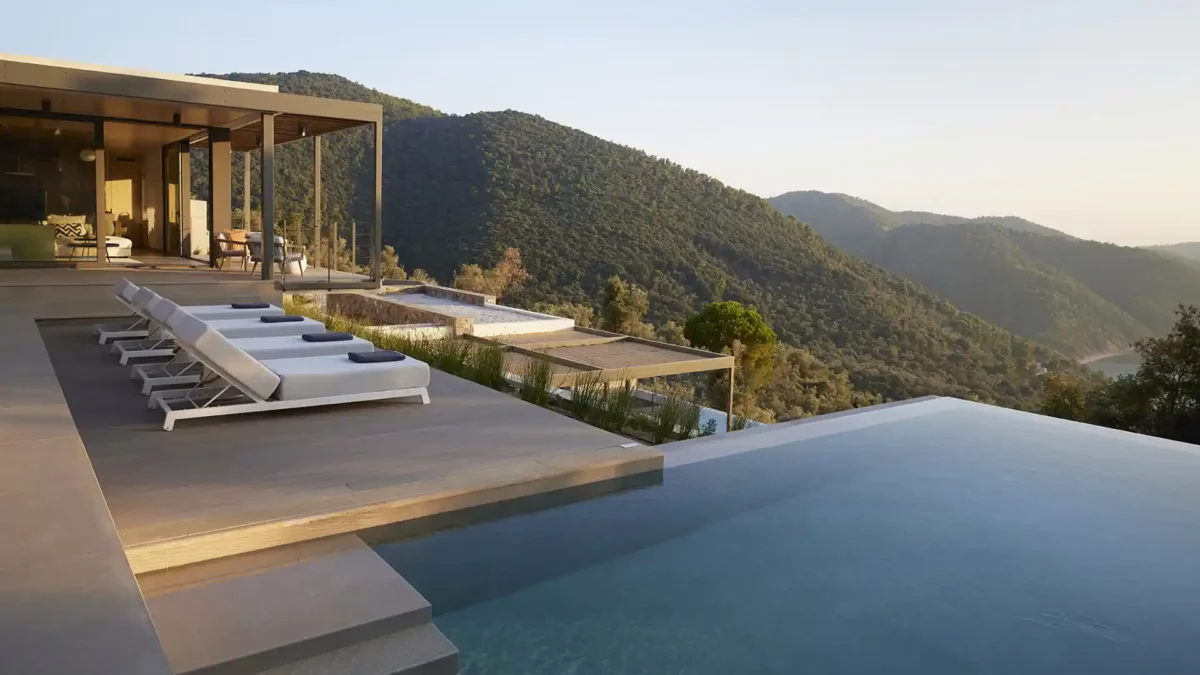 Les espaces extérieurs d’Olive Two sont organisés pour profiter pleinement du cadre environnant. La piscine privée à débordement (7,5 x 3,75 m) occupe un côté de la terrasse principale et dispose d’une douche extérieure. À proximité, une pergola ombragée accueille l’espace repas extérieur avec barbecue.