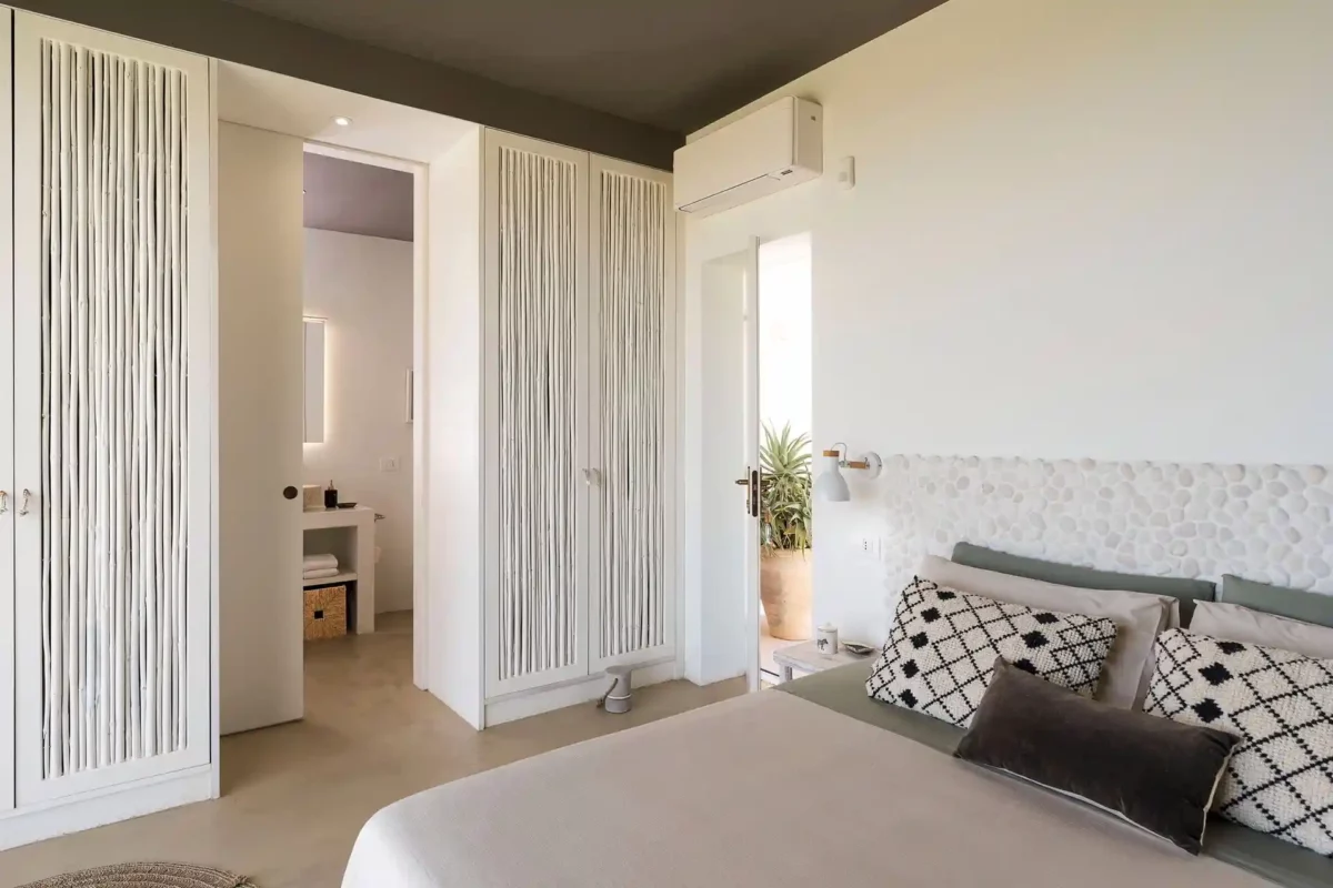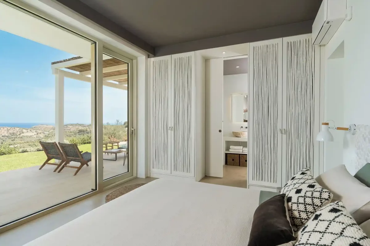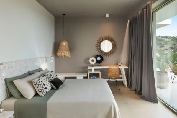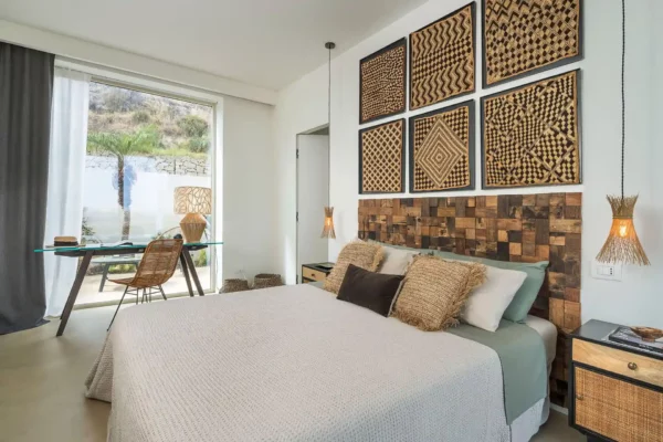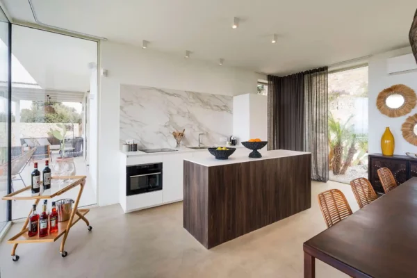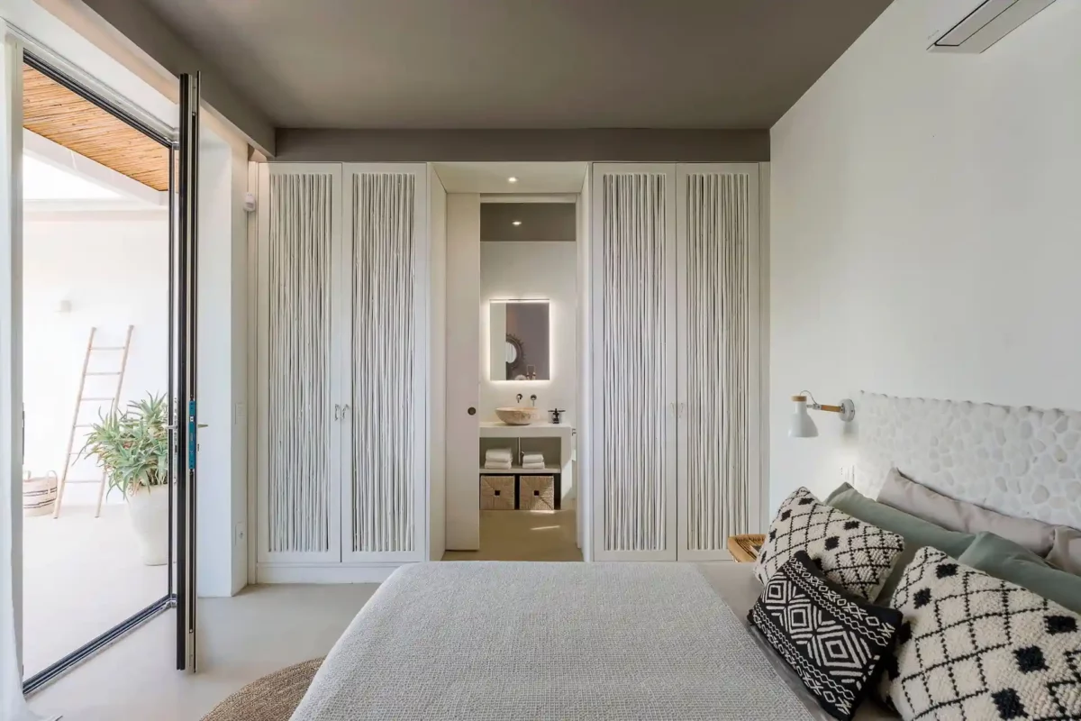 Le plan de la maison privilégie la liberté de mouvement : l’espace de vie central est complété par des chambres conçues comme des unités autonomes. Deux des trois chambres disposent de leur propre entrée par la terrasse, permettant à chaque invité de rejoindre la piscine ou son jardin privé sans traverser le séjour.