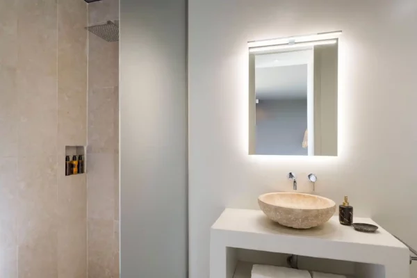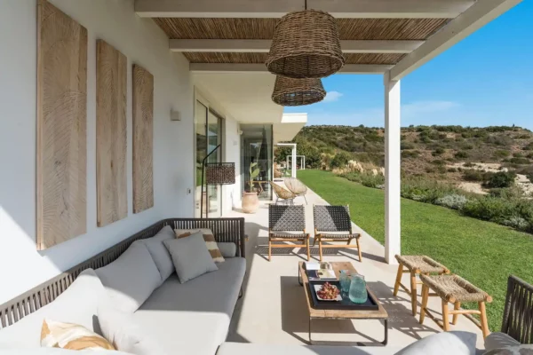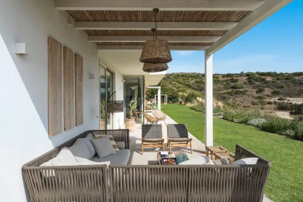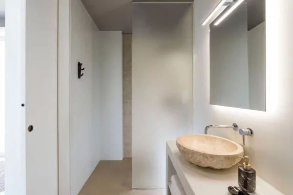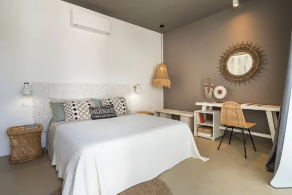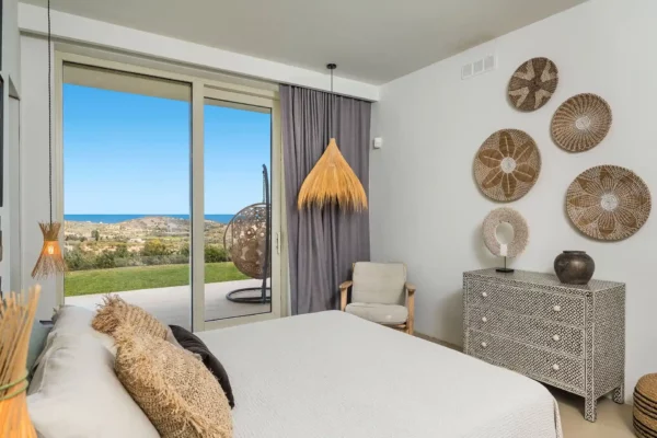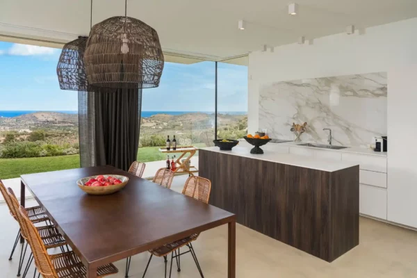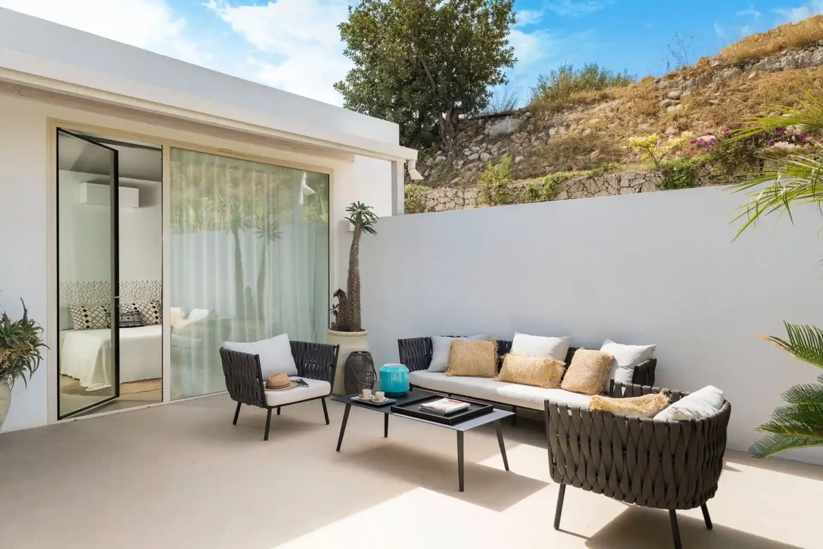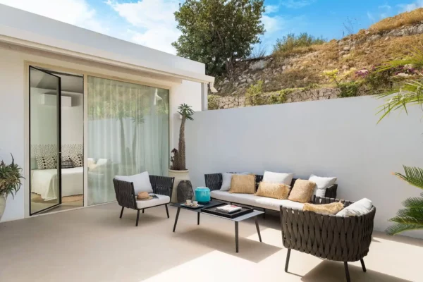 Le plan de la maison privilégie la liberté de mouvement : l’espace de vie central est complété par des chambres conçues comme des unités autonomes. Deux des trois chambres disposent de leur propre entrée par la terrasse, permettant à chaque invité de rejoindre la piscine ou son jardin privé sans traverser le séjour.