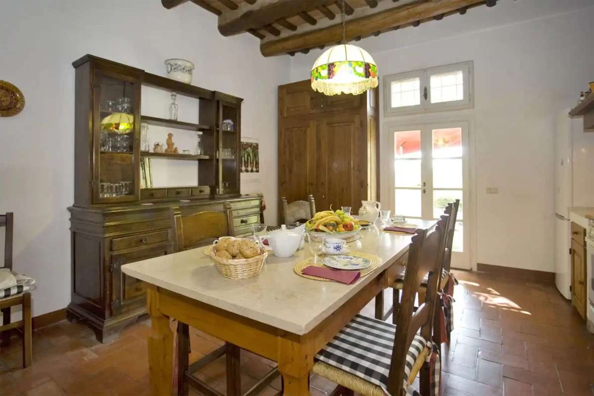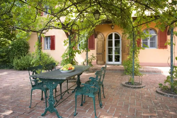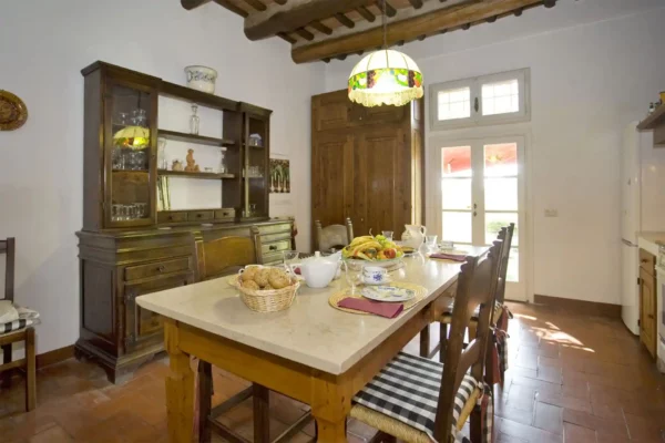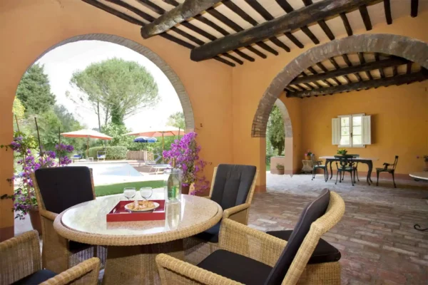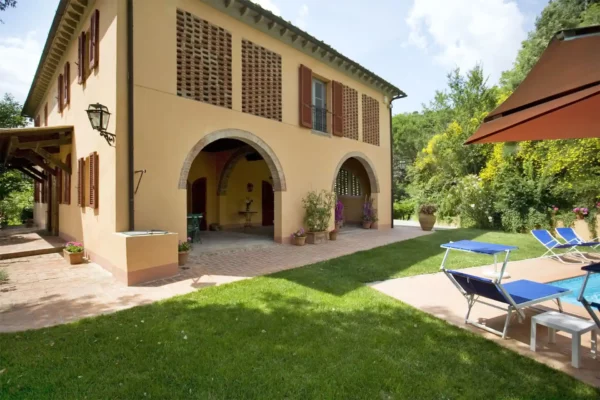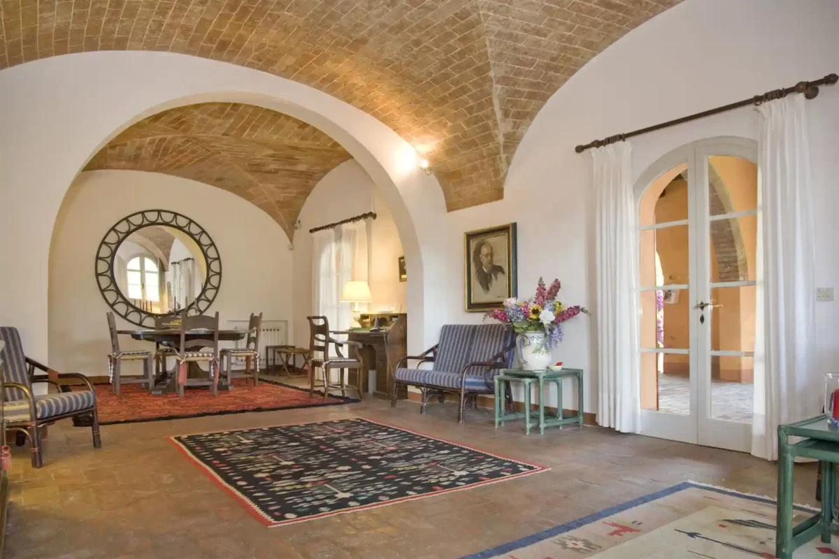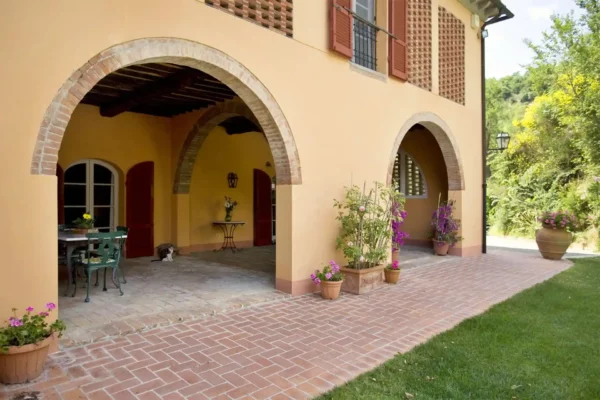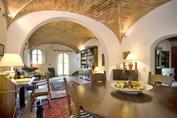 Le Ferrine a été restaurée avec soin, conservant l’âme de la villa de charme (sols en cotto d’origine), tout en offrant un aménagement pratique. Le grand salon voûté est une pièce maîtresse, s’ouvrant sur un porche voûté, parfait pour les repas en plein air devant le beau jardin.
