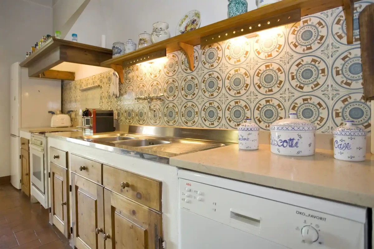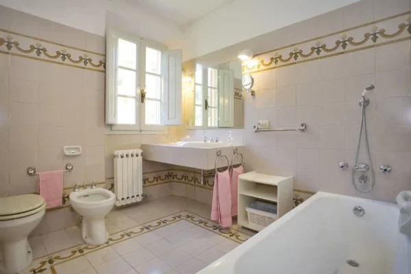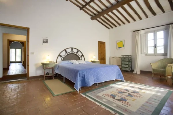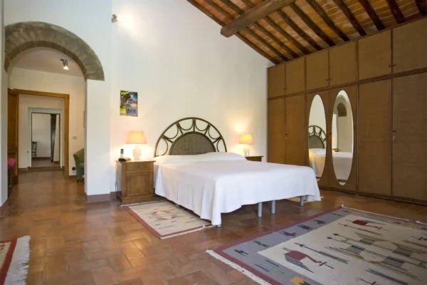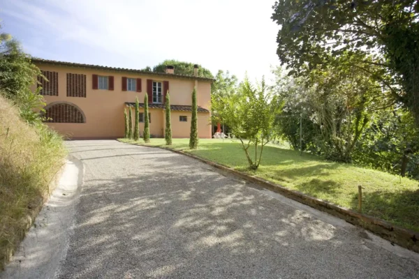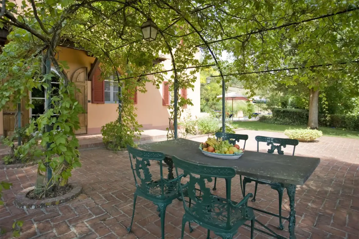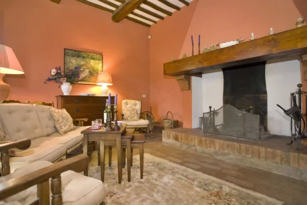 Le Ferrine a été restaurée avec soin, conservant l’âme de la villa de charme (sols en cotto d’origine), tout en offrant un aménagement pratique. Le grand salon voûté est une pièce maîtresse, s’ouvrant sur un porche voûté, parfait pour les repas en plein air devant le beau jardin.